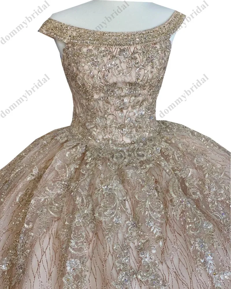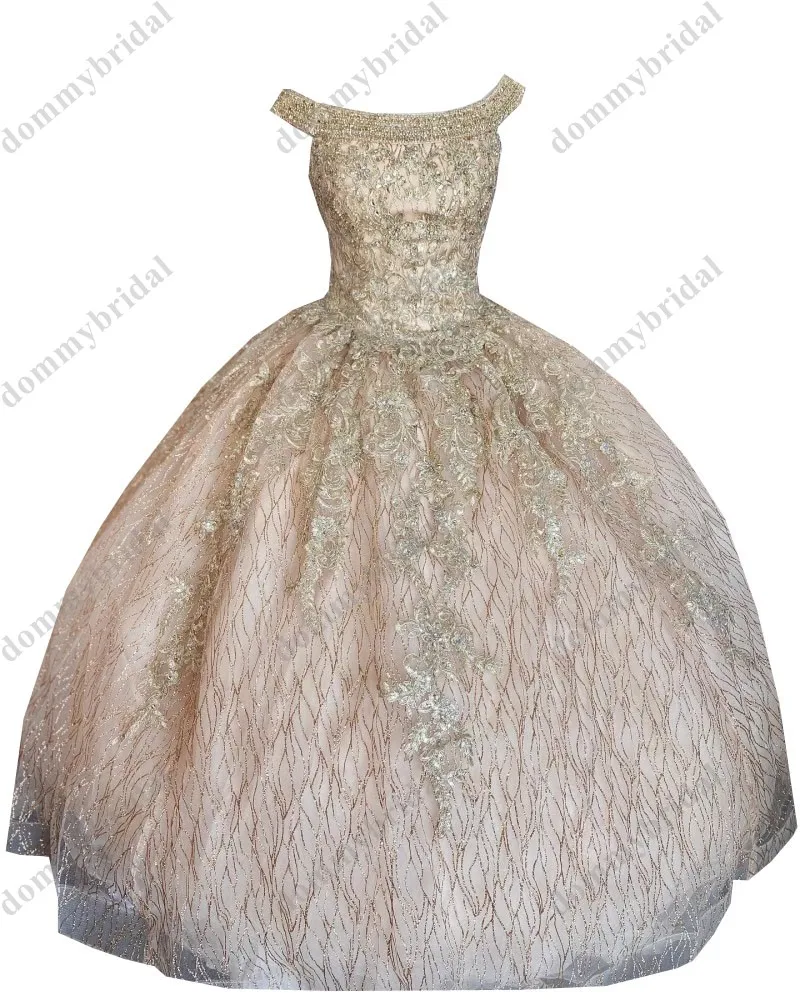 Блестящее розовое золото 2022 Дешевое платье для выпускного вечера Quinceanera длинное с открытыми плечами Золотое кружево вышитая аппликация с узором Charra XV