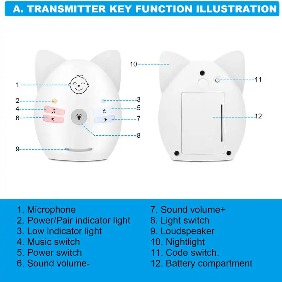 ● Принять спектральный разброс частоты (FHSS), анти-помехи и четкость звука● Диапазон рабочих частот: 900 МГц ISM, 908-925 МГц● Дальняя дистанционная передача 200-300 метров в открытом поле● Передатчик и приемник должны сделать код сопряжения перед любой операцией, конфиденциальность в сильной● С 2 способ обсуждения, музыки и Функция ночника,● Когда нет звука от передатчика в течение 20 секунд, приемник будет в отключенном состоянии