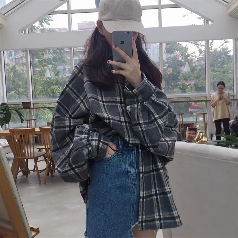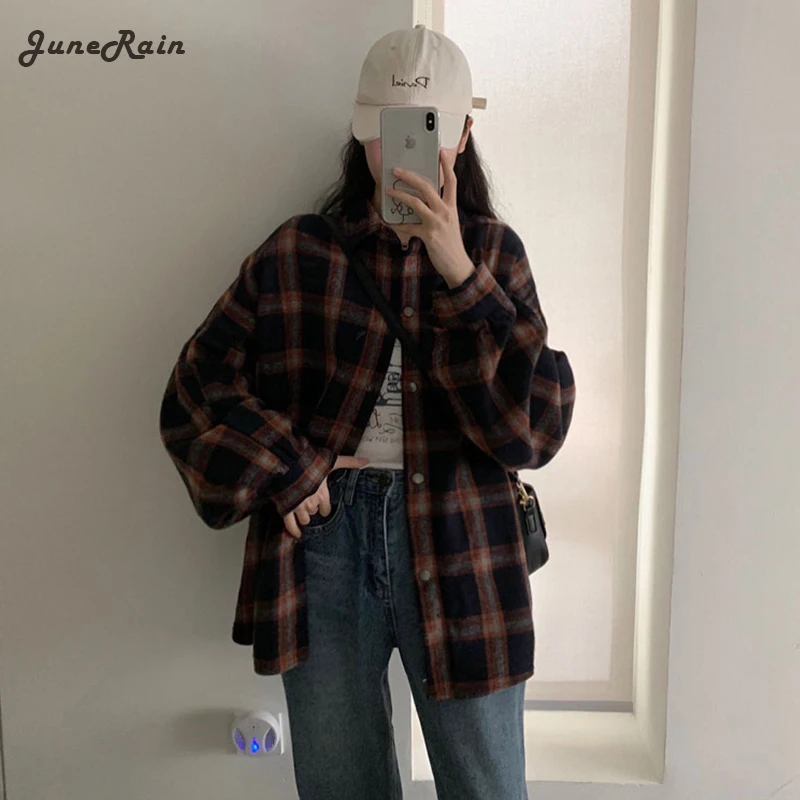 JuneRain Женская Весенняя уличная блузка Рубашки винтажная клетчатая фланелевая рубашка бойфренда туника для женщин повседневные корейские Топы