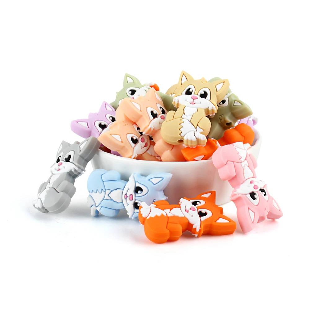 10 шт., силиконовые бусины для прорезывания зубов с лисой, DIY, детские соски для кормления, ожерелье, сенсорная игрушка, милые животные, пищевая мини-прорезыватель для зубов