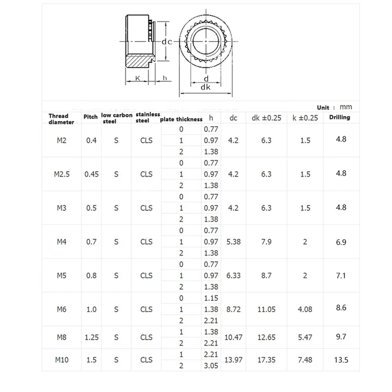 Обработка поверхности:Цинковое покрытиеРазмер FormS-M6-1-1.4: Средний Материал: углеродистая сталь, диаметр резьбы 6 мм, Код толщины пластины: 1, толщина пластины: 1,4 м;