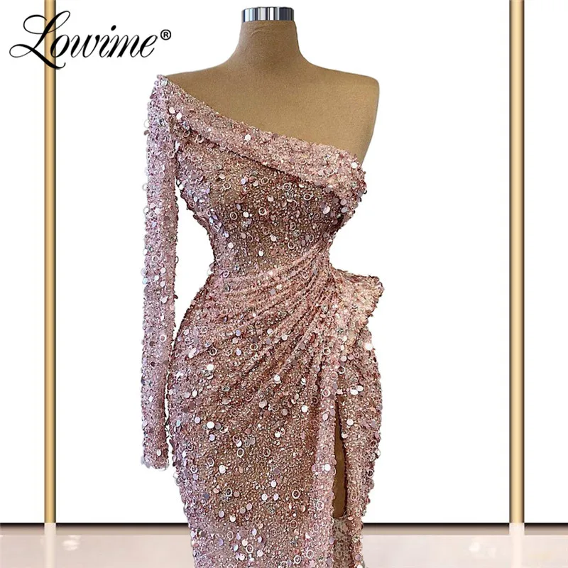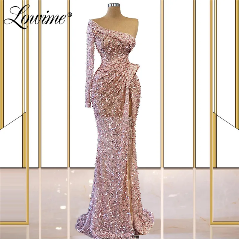 Lowime розовый Бисер Вечерние платья Длинные Платья знаменитостей 2021 новейшая модель размера плюс Дубайский арабский вечернее платье на одно плечо вечерние платья халат