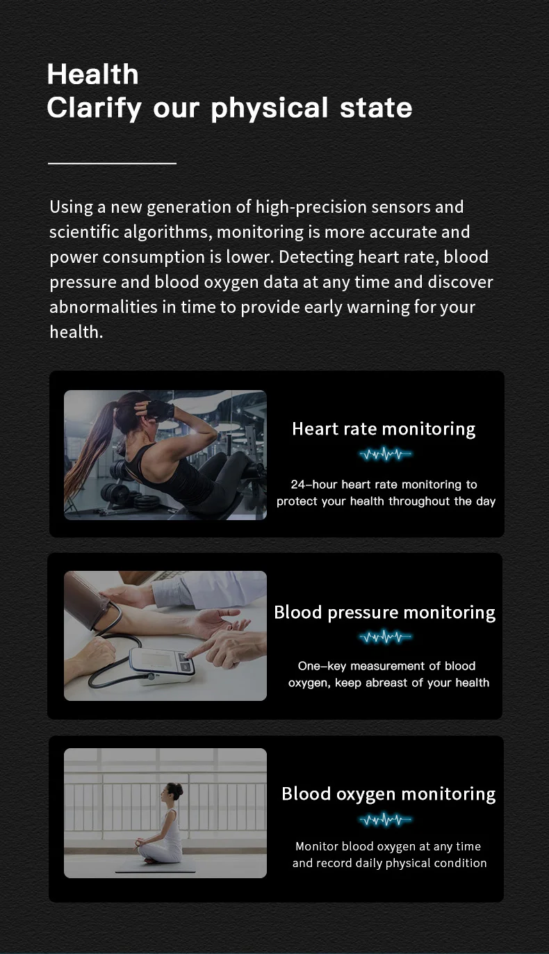 1. После получения часов, пожалуйста, зарядите сначала. Потому что после длительного периода логистики часы имеют низкую батарею.2. Перед использованием отсканируйте qr-код в руководстве, чтобы загрузить приложение и подключить его к часам с помощью приложения.3. Хотя часы могут контролировать частоту сердечных сокращений, они не могут быть использованы для любых медицинских целей, это только для того, чтобы помочь людям жить более здоровой жизнью. Все результаты измерений приведены только для справки. Они основаны на научных алгоритмах и датчиках. Поэтому, пожалуйста, не сравнивайте их с медицинскими устройствами, мы ценим ваше понимание.