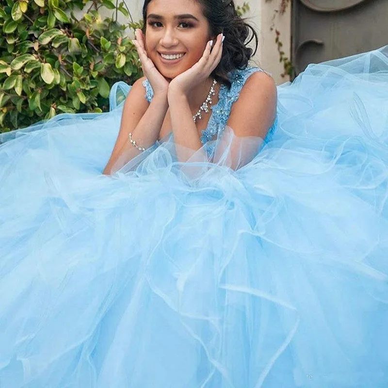 Милой принцессы 15 бальное платье светильник Небесно голубой Бальные платья 2021 с v-образным вырезом с аппликацией для детей, платье без рукавов с блестками праздничное платье Многоуровневое