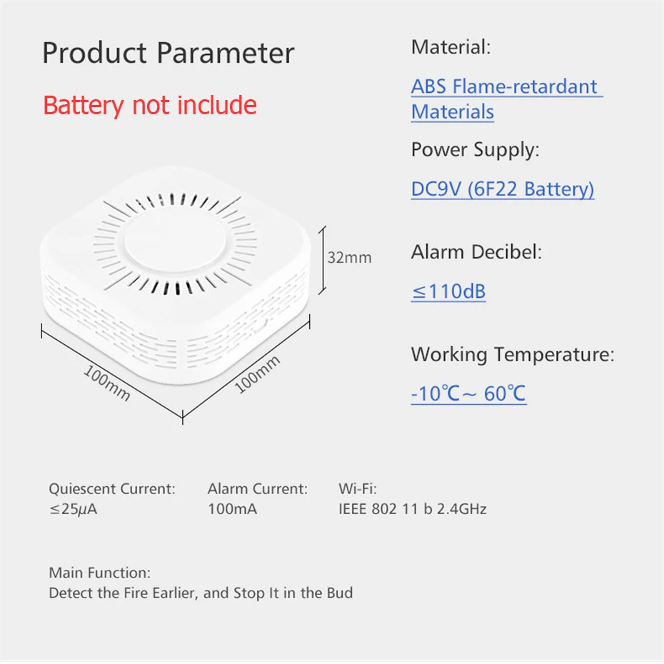 Цвет: белыйМатериал: АБС + датчик высокой чувствительностиПитание: 9 В постоянного тока (6F22Батарея, не входит в комплект)Ток покоя: ≤ 25uAТок сигнала тревоги: 100 мАДецибел сигнализации: ≤ 110 дБТемпература окружающей среды: -10 °C ~ + 60 °CВысота установки: ≥ 6 мЧувствительность дыма: Grade классРазмер: 105x105x38 ммВес: 130 г