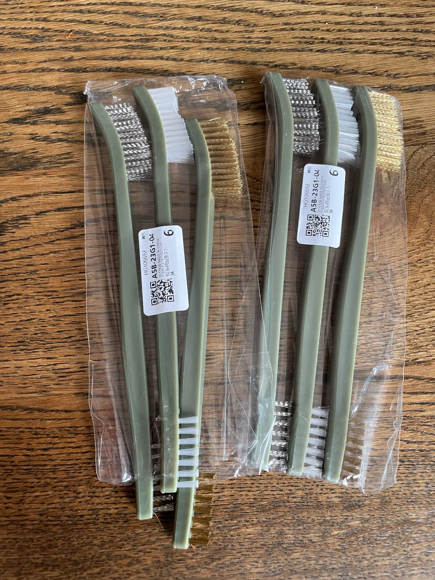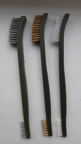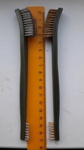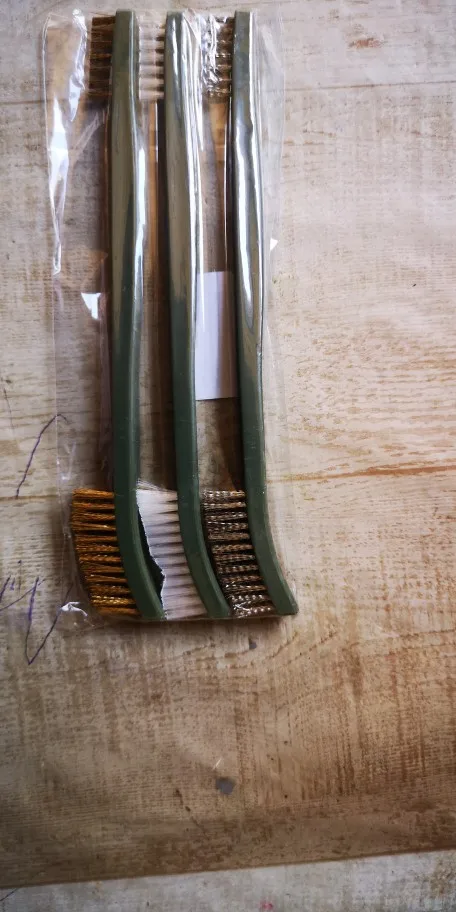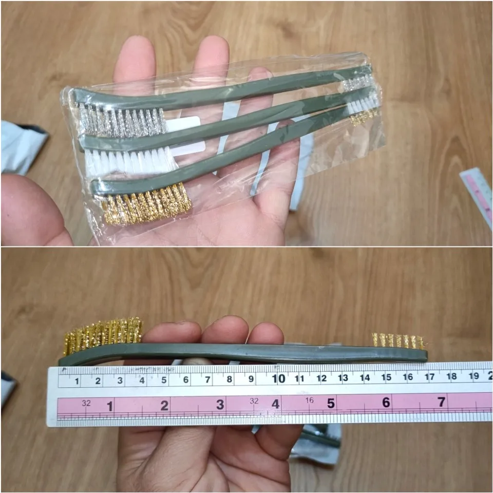 Продукт верен описанию. Я приезжаю в Испанию через две недели, завернутый в простую пластиковую сумку, без защиты. This lot is consistent with Three Wire BRUSHES: One of metal, Another nylon and Another Yellow bronze. Корпус Пластиковый и имеет длину 17 см. Ширина 0,5 см и 1 см соответственно. Характеристика этих кистей заключается в том, что у них есть «щетина» с обеих сторон, одна толще, а другая меньше и тоньше, чтобы получить доступ к труднодоступным или более деликатным местам. Они идеально подходят для очистки орехов или ржавых щеток, чтобы облегчить удаление болтов. Нейлон довольно мягкий. Металлические Щетки более жесткие, но довольно гибкие, но они делают свою работу. Я не считаю, что это профессиональные инструменты, но пунктуальные или для поделок, возможно, для очистки и обслуживания механических инструментов или DIY. За свою цену 2 доллара это хорошая покупка.