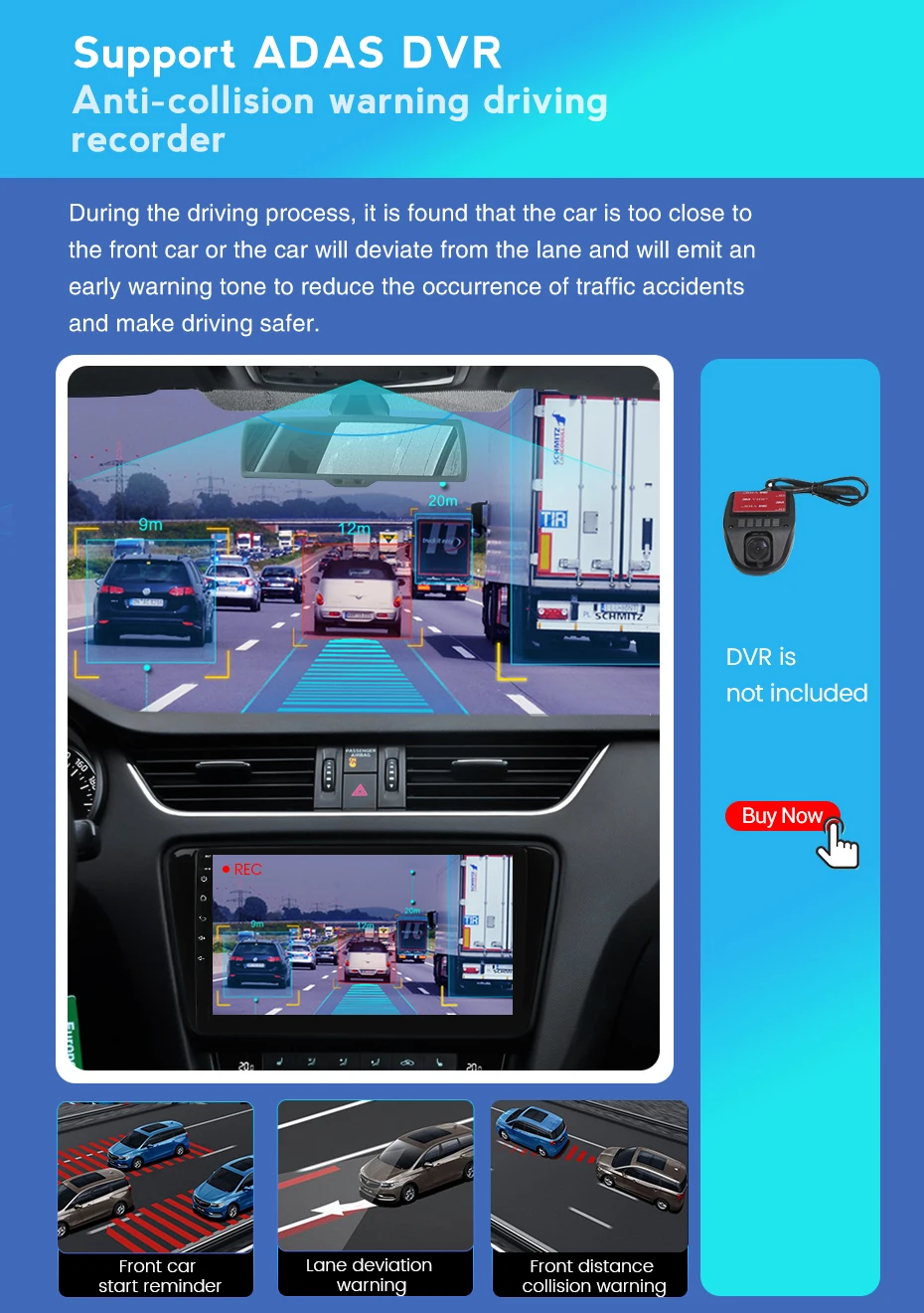 > Поддержка видеорегистратора ADAS с защитой от столкновенийВо время вождения, обнаружено, что автомобиль находится слишком близко к переднему автомобилю или автомобиль будет отклоняться от полосы движения и издаст сигнал раннего предупреждения, чтобы уменьшить вероятность дорожно-транспортных происшествий и сделать вождение более безопасным. При необходимости, пожалуйста, нажмите на картинку, чтобы купить