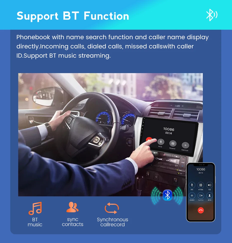 Телефонная книга с функцией поиска имени и отображением имени звонящего напрямую. Входящие звонки, звонки, пропущенные звонки с идентификатором звонящего. Поддержка потоковой передачи музыки BT.
