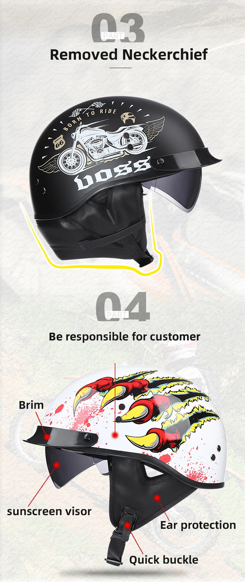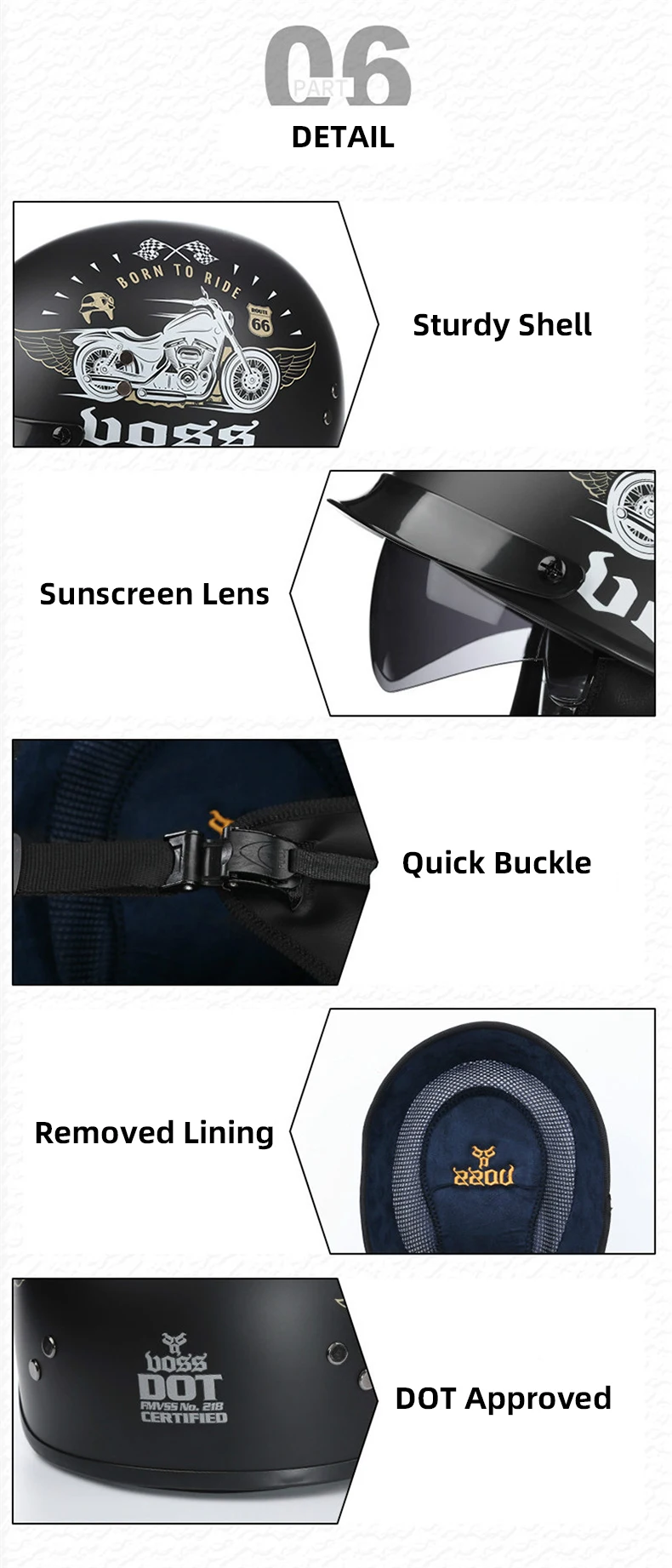 В настоящее время мы находимся на стадии очистки нашего инвентаря, и мы специально предоставляем купон в 3 доллара. Он больше не будет предоставляться после периода события. Во время мероприятия, запас ограничен. Пожалуйста, оплатите в течение 30 минут. В противном случае система автоматически отменит заказ. Характеристика: Высокопрочный корпус из АБС-пластика, легкий и ударопрочный Гладкий и легкий дизайн уменьшает шум ветра Многослойный буферный слой EPS обеспечивает современное поглощение энергии. Комфортная мягкая подкладка из дышащей технической ткани, гипоаллергенная, высококачественная ткань, мягкая, впитывающая, вентиляция, лучшая гибкость; Больше чистоты Дизайн очков обеспечивает защиту от ультрафиолета БЫСТРОРАЗЪЕМНАЯ Пряжка для надежной фиксации, которая останется на вашей голове Разумный Дизайн: подарите вам удовольствие от поездки DOT сертификация, гарантия качества Съемный защитный чехол для ушей Спецификация: Материал: Синтетическая кожа, АБС-пластик. EPS Цвет: как на картинке Вес: шлем 1000 г Размер шлема: M(57-58 см),L(59-60 см),XL(61-62 см),XXL(63-64 см) Наименование товара: мотоциклетные шлемы, мотоциклетный шлем с полулицевой поверхностью ABS Посылка включает: 1 * мотоциклетный шлем