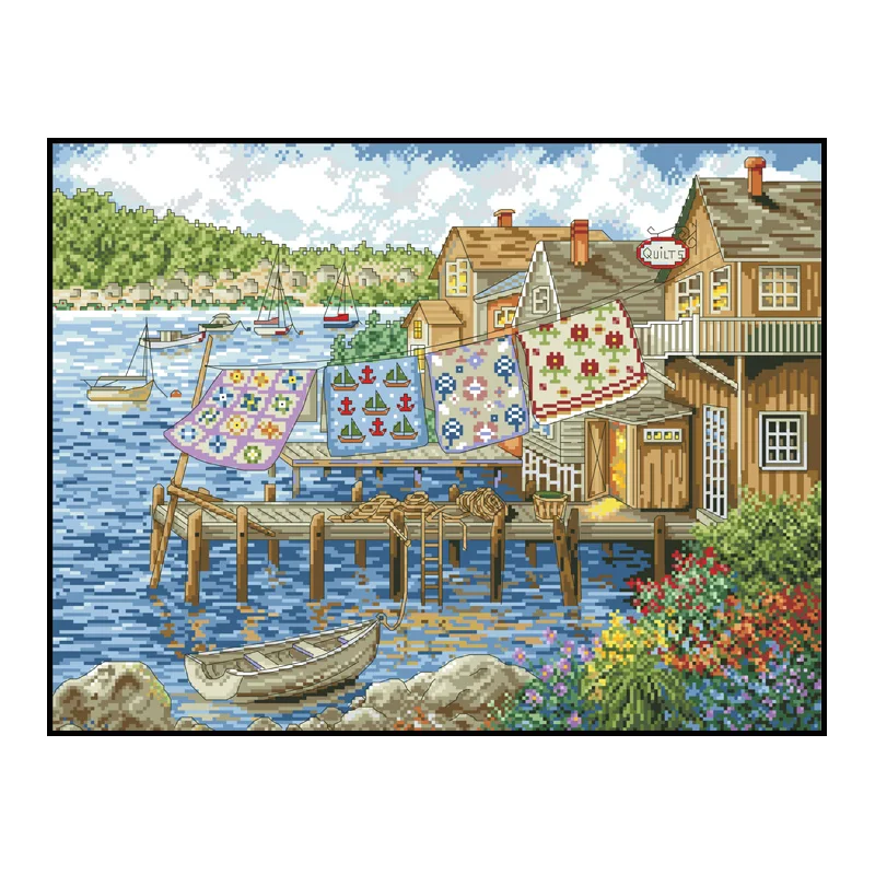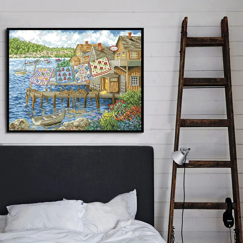 Вышивка крестом, пейзаж, домики у озера, 11CT, 14CT, наборы для выш...