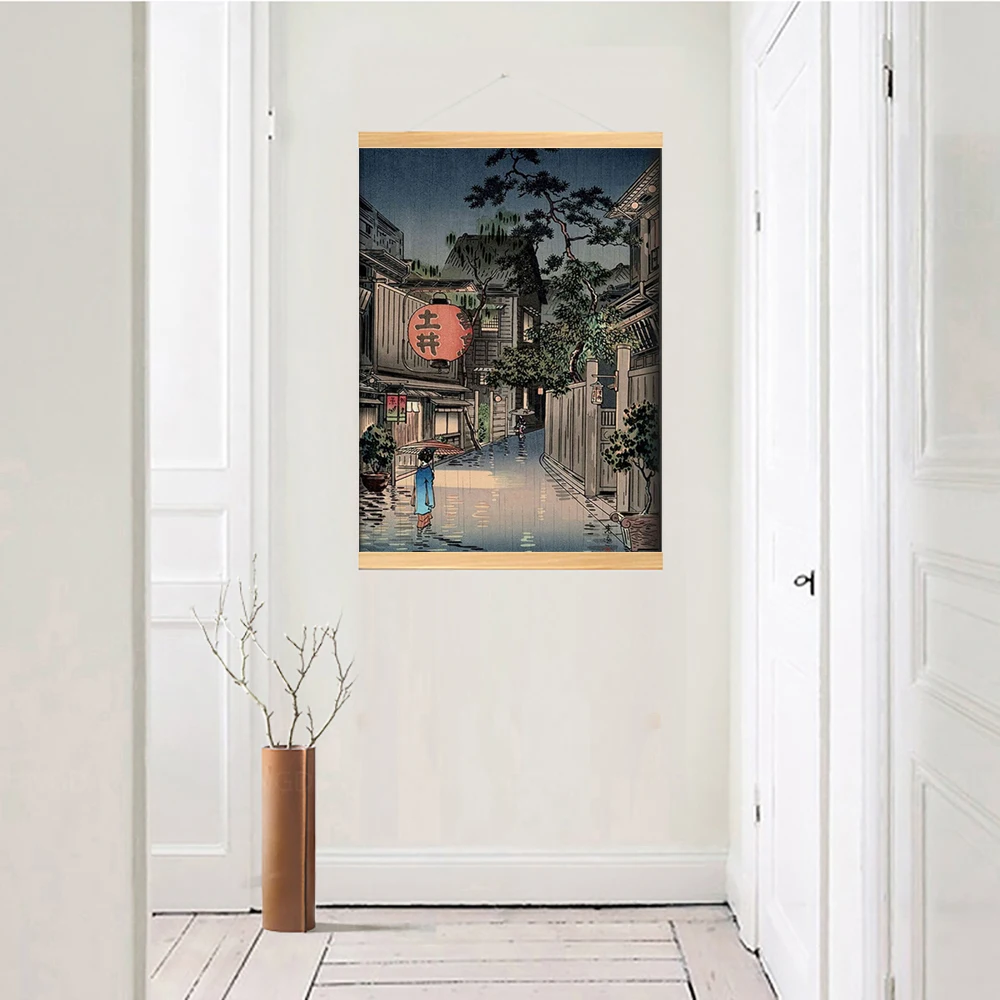 Домашний декор, Постер в японском уличном стиле, картины на холсте ночного дождливого вида, настенное искусство, деревянный свиток, подвесная картина, прикроватный фон