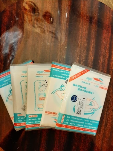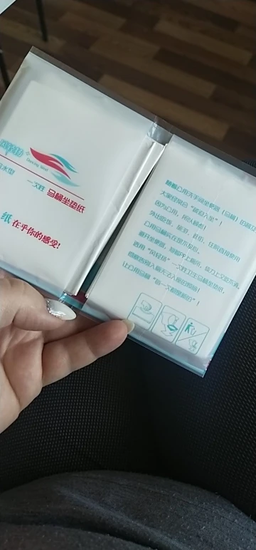 Компактная упаковка, в которой помещается 10 накладок. Размер такой же, как сложенная гигиеническая прокладка. Бумага тонкая, но плотная. Со своими функциями полностью справляется.