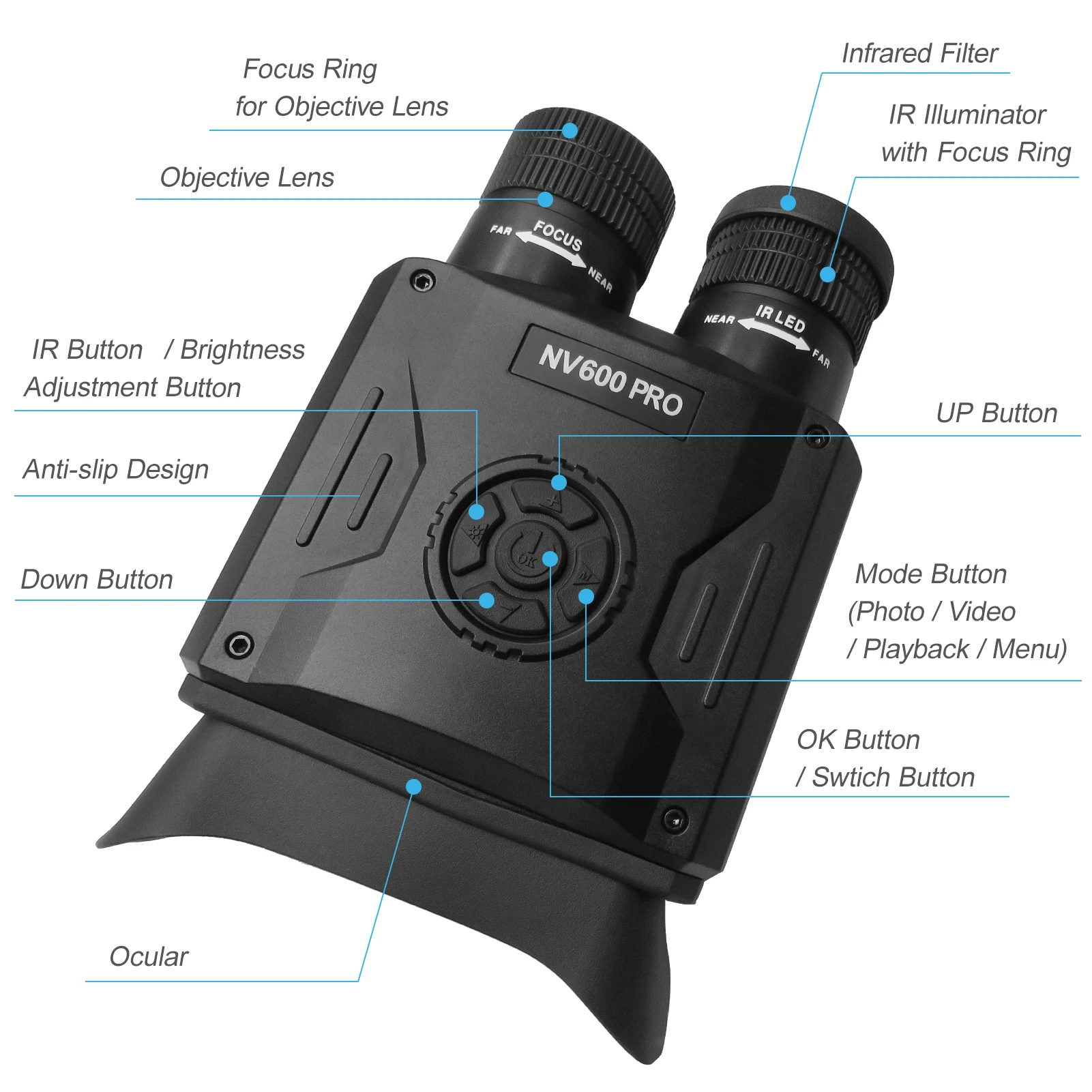NVE-D31:Вы можете снимать фотографии или снимать видео в темноте после вставки TF-карты (не входит в комплект). Включите ИК светильник КУ, которая позволяет наблюдать за мишенью в полной темноте. Загрузите приложение и Подключите свой телефон через Wi-Fi, передает с оборудования, тогда изображение на оборудовании будет синхронизировано с вашим смартфоном, чтобы вы могли просматривать изображения. Этот прицел ночного видения станет отличным помощником во время ночного наблюдения за дикой природой, поиска и исследования долины.Особенности:Полноцветное Изображение 1080P: ночное и дневное видение, изображение днем и при слабосветильник щении цветное, черно-белое во время полной темноты.Большое видимое расстояние: 2-кратное цифровое увеличение и 2-кратное увеличение, с невидимой ИК-дальностью 164 нм, видимое расстояние может быть более ярдов в полной темноте.Четкое фото и видео: разрешение 1080P, более четкое, вы можете вставить TF-карту (не входит в комплект) для съемки видео или фотосъемки во время просмотра дикой природы на улице.Удобство: Загрузите приложение и подключите телефон к оборудованию через Wi-Fi, передайте его с оборудования, и тогда вы сможете просматривать четкое изображение в реальном времени. Водонепроницаемость IP55 защищает от светильник большого дождя, пожалуйста, не замачивайте в воде в течение длительного времени.Перезаряжаемый: встроенный аккумулятор 5000 мАч, около 3-6 часов работы после 4 часов полной зарядки, больше нет необходимости менять батарею, и вы можете даже заряжать от внешнего аккумулятора при наличии интерфейса USB (ток зарядки: 5 В, 2 а).Легкий вес: алюминиевый сплав и пластиковая конструкция, всего фунта, легкий и прочный, легко устанавливается на тройную подставку (не входит в комплект). Поставляется с ремешком для удобной переноски и транспортировки. Подходит для просмотра дикой природы, наблюдения и исследования долины в темноте.Характеристики:Увеличение: 2.3XЦифровой зум: 2XОбъектив: 30 ммДлина объективной фокусировки: 30 ммРасстояние полной темноты: 150 м/164 ярдовДлина ИК-волны: 850 нмУсловия работы: день и ночьДиоптрии: от-5 до 3Wi-Fi: 1080PРазрешение записи: 1080PТок зарядки: 5 В, 2 АЕмкость: (не входит в комплект) Макс. Карта TF 128 ГБ (класс 4 +)Аккумулятор: 1*3,7 в, 5000 мАч, 26650 литиевый аккумулятор (входит в комплект)Время работы: около 3 - 6 часовВремя зарядки: около 4 часовВодонепроницаемость: IP 55Рабочая температура: от-20 ℃ до 55 ℃Температура хранения: от-30 ℃ до 60 ℃Материал: алюминиевый сплав + пластикРазмер: 200*52*75 мм/7,9*2,0*3,0 дюймаВес: прибл. 344,8 г/0,8 фунтаПосылка: 225*120*75 мм/8,9*4,7*3,0 дюймаВес посылка: прибл. 632,0 г/1,4 фунтаПосылка тация:1 * монокуляр ночного видения1 * повязка на глаза1 * зарядный кабель Type-C1 * Руководство пользователя1 * чистящая ткань1 * ручной ремешокNV600 PRO:Это цифровое ночное устройство предназначено для дневного и ночного использования, позволяет четко просматривать объекты. Он имеет несколько функций, таких как фото, видео и воспроизведение. Благодаря специальному инфракрасному осветителю пользователь может видеть удаленную цель на расстоянии до 500 метров в полной темноте. Идеально подходит для ночных занятий.Особенности:Обеспечивает четкий обзор до 5-кратного оптического зума и 8-кратного цифрового зума, что позволяет увеличить или уменьшить масштаб.Большой объектив 35 мм с широким полем обзора.Большой экран 3,5 дюйма с в