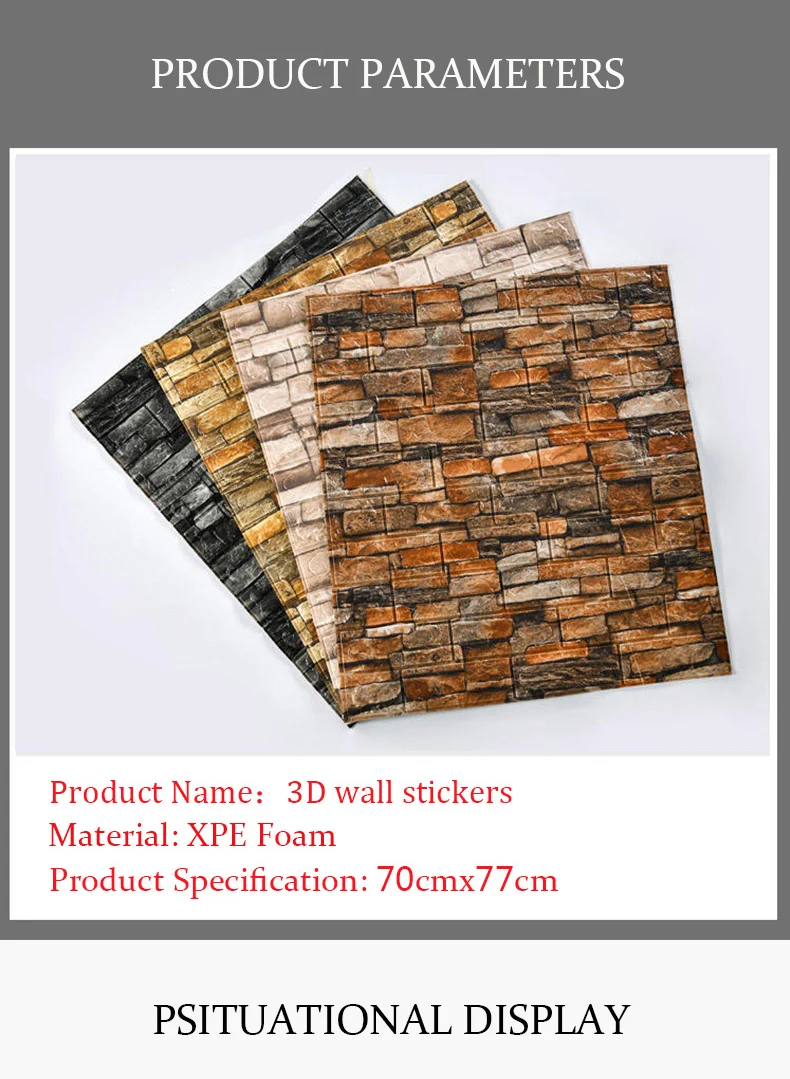 Материал: пена XPeРазмер изделия: 70*77 см за штуку. 10 шт 5,39 квадратных метровСтиль настенной наклейки: 3D наклейки на стену, продукт поставляется с клеем Характеристика:1: трехмерная декоративная мягкая пена, защита от столкновений для детей, забота о вашей семье.2: Безопасность и защита окружающей среды, нетоксичный запах, подходит для семейного безопасного домашнего пространства.3: Реалистичный, естественный эффект кирпичного узора, простой и современный стиль.4: Бесплатный DIY, простой самоклеящийся дизайн, установка, повседневный коллаж, произвольный крой.5: сравнение обоев с улучшенным эффектом шумоподавления.Способы установки и инструментыПодготовка: Очистите поверхность с адгезией, например: поверхность из дерева, поверхность из стекла, не Пылезащитная стена, нажмите на дно шпатлевки и так далее.Паста: на заднюю крышку разорвана бумага, приклеенная К вспомогательным инструментам: ножницы, ножВнимание: пожалуйста, купите достаточное количество единиц товара, чтобы убедиться, что они поставляются из одной партии, чтобы избежать разницы в цвете.