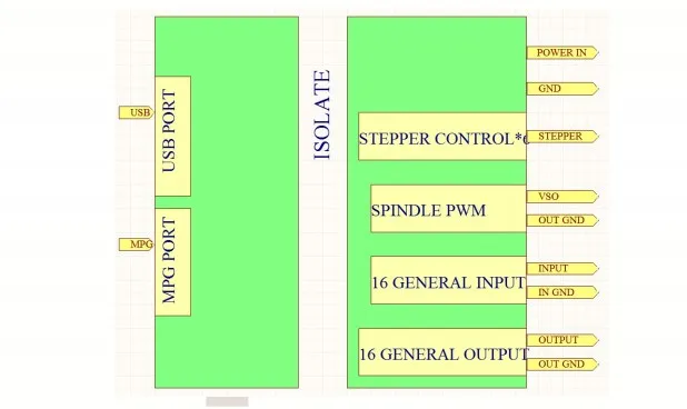 Поддержка usb-порта; Фотоэлектрический изолированный входной интерфейс с 16 портами; 16 портов фотоэлектрический изолированный выход интерфейс; 1 порт 0-10 В Скорость вращения шпинделя аналоговый выходной интерфейс (можно изменить на выход ШИМ); Can Поддержка 6 с одноосным шаговым системы maxisim,125 кГц импульсный выход для каждой оси; Микросхема управления движением руки; Основным устройством является 12V-32VDC вход источника питания, ток должен быть ВЫШЕ 1А;