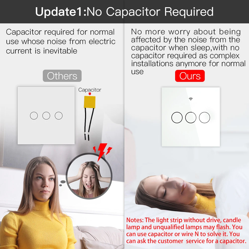Характеристика:1. Нет нейтрального провода или нейтрального провода по желанию. Если в вашем доме нет нейтрального провода, просто игнорируйте.2. Нет конденсатора для нейтральной версии провода для лучшего пользовательского опыта. Светильник без привода, Свеча и неквалифицированные лампы могут мигать. Вы можете использовать конденсатор или провод N для его решения. Вы можете обратиться в службу поддержки клиентов за конденсатором. Даже если вам нужен конденсатор, нет шума.3. Совместимость с Alexa,Google home и яндексом позволяет свободно управлять голосом; Удаленное управление устройствами и интеллектуальными настройками допускается на вашем смартфоне через приложение smart Life/Tuya, где бы вы ни находились; возьмите полный контроль за подключенными приборами с таймером, расписанием и обратным отсчетом (1/5/30 минут, 1 час и т. д.) с помощью приложения; Поделитесь контролем с семьей и друзьями для дополнительного удобства.4. Емкостное сенсорное управление, включение/выключение вашего светильник с помощью одной сенсорной и устойчивой к царапинам стеклянной панели дает лучший вид, чтобы сочетаться с любым дизайном стены.5. Этот смарт-переключатель может управляться разными способами в отдельности с лучшим значением, таким как управление приложением, сенсорное управление и голосовое управление; достичь мульти-контроля, связываясь с другими умными переключателями, чтобы получить 2/3-way цепи для вашего дома света.6. Этот переключатель поддерживает Голосовое управление, сенсорное управление и управление приложением. Достичь мульти-контроля, связываясь с другими умными переключателями, чтобы получить 2/3-way цепи для вашего дома света.7. Как достичь мульти-контроля:Шаг 1:Если в вашем доме есть нейтральный провод, вам нужен провод N для достижения мульти-контроля.Если в вашем доме нет нейтрального провода, вы можете шунтировать конденсатор на лампе (переключатель, подключенный к этой лампе, не полностью загружен. Например, 3 переключателя просто нужен провод L1.) и не будет nosie.Способ подключения проводов выглядит следующим образом (только для справки):