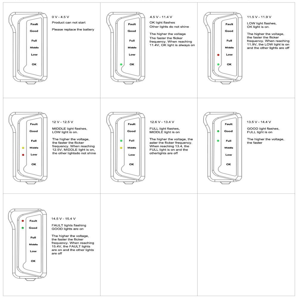 Включите фары в течение 1-2 минут, а затем выключите их. Извлеките зажим аккумулятора из аккумулятора, подождите около 10 минут, а затем Зажмите тестер батареи. Сигнальный светильник будет светильник в зависимости от состояния зарядки аккумулятора, указывая «полный», «Средний» или «низкий».