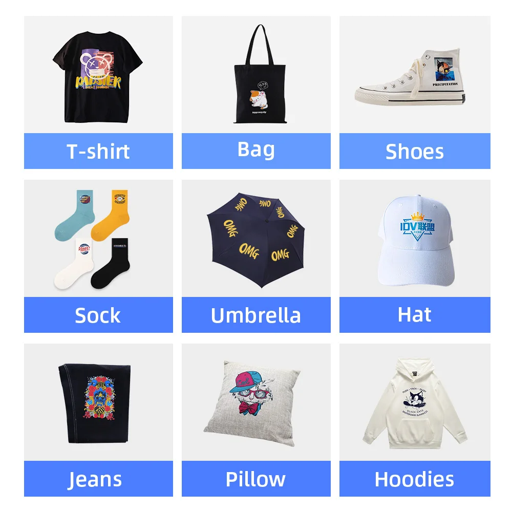 Принтер A3 1 штA3 прозрачная пленка из ПЭТ 100 штПорошок горячего расплава 1 кгТекстильные пигментные чернила 4*100 млТекстильные пигментные чернила белый 100 мл9,0 версия программного обеспечения для печати 1 шт.
