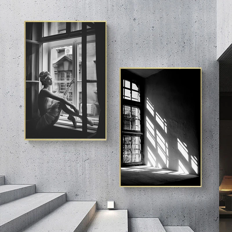 Настенная картина черного и белого цвета с изображением балерины, девушки, окна, холст, винтажные постеры и принты, настенные картины для гостиной, домашний декор