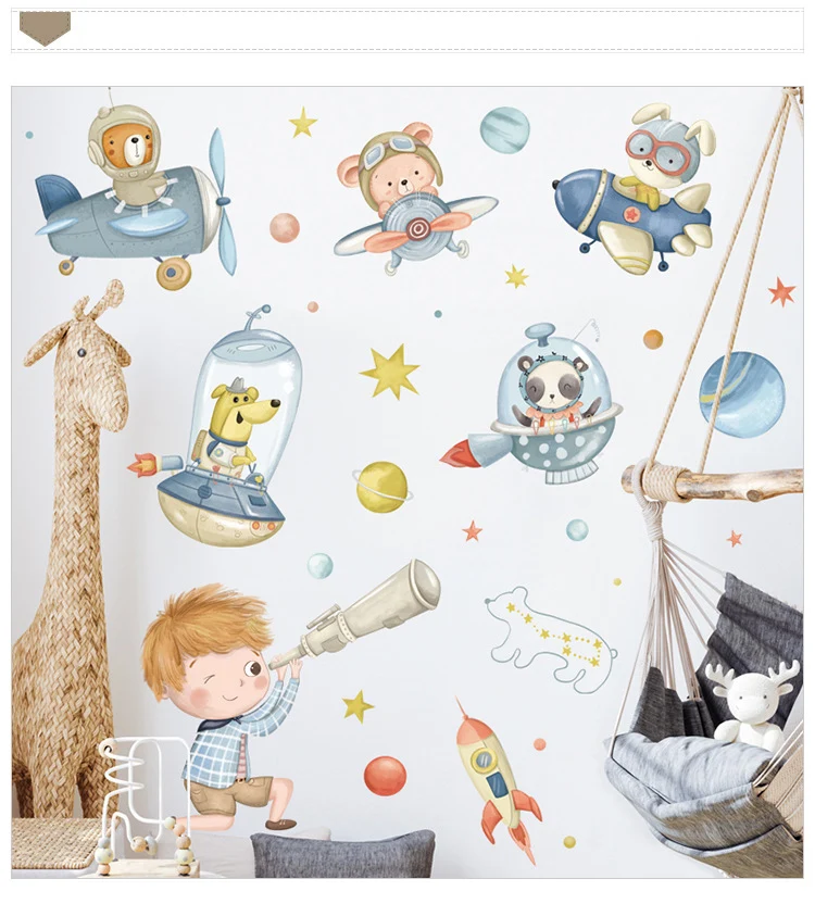 Мультяшные животные, космический полет, настенные наклейки для детс...