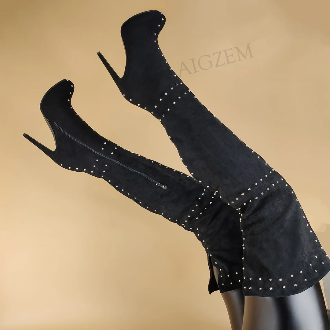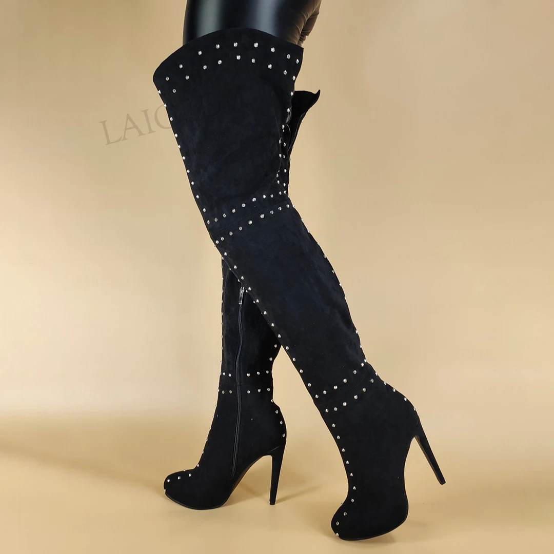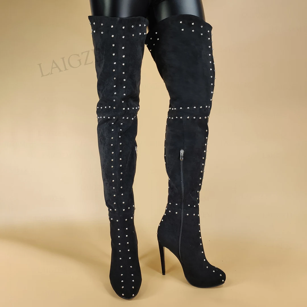 LAIGZEM супер женские сапоги до бедра; Высокие сапоги из искусственной замши с заклепками на платформе и высоких каблуках, женские сапоги выше колена, обувь для женщин, большой Размеры 38, 42, 46, 47 (Европа); 52
