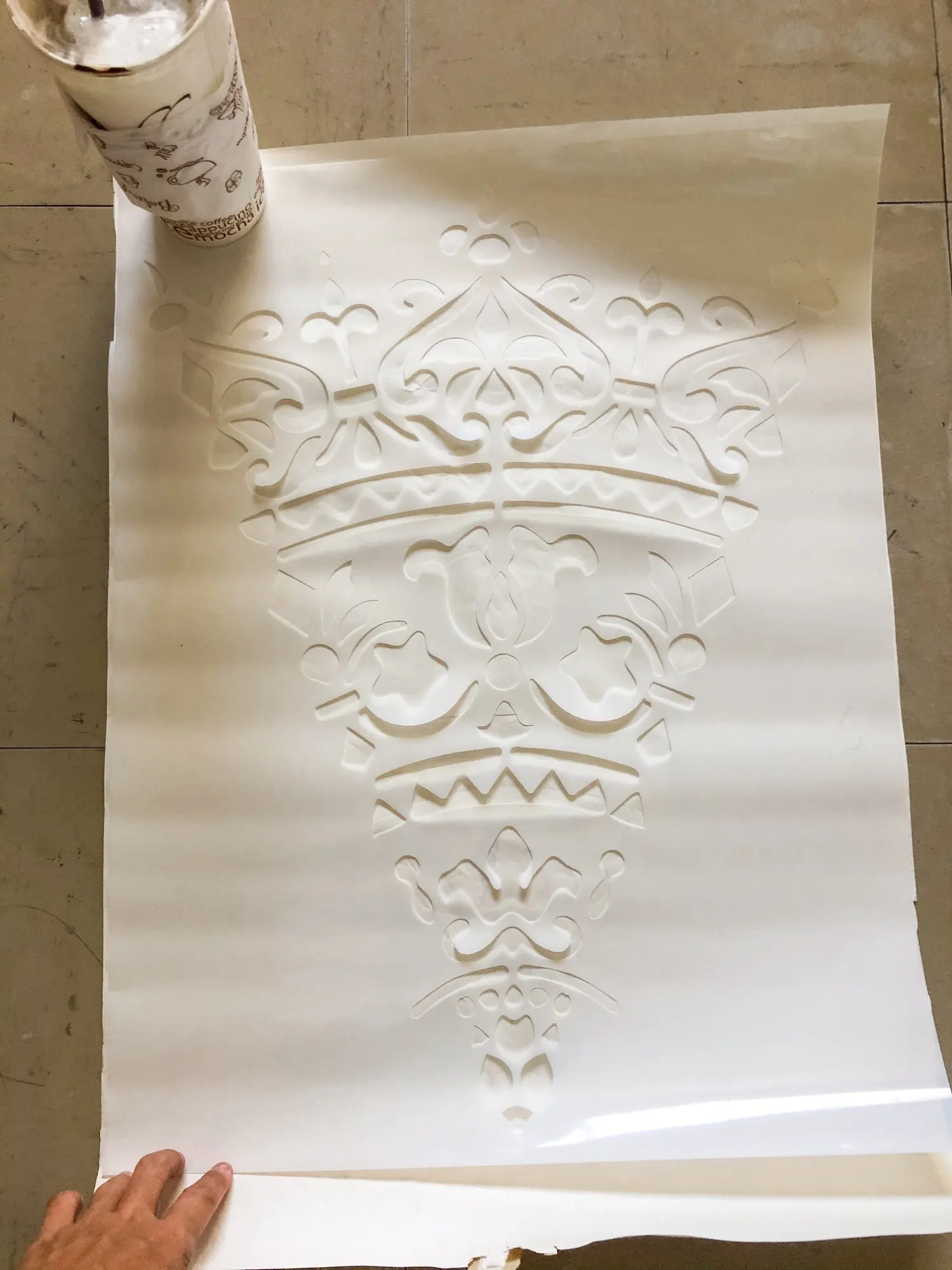 Шаг 2: мы настоятельно рекомендуем использовать распылительный клей и распылить клей на обратную сторону трафарета. Загрузите лакокрасочный валик (или кисть) с вашим любимым цветом. Затем разгрузите излишки краски с валика (или кисти) на бумажное полотенце. Этот метод разгрузки помогает обеспечить равномерное распределение краски по валику, вы используете минимальное количество краски, а также предотвратить кровотечение краски под трафаретом.