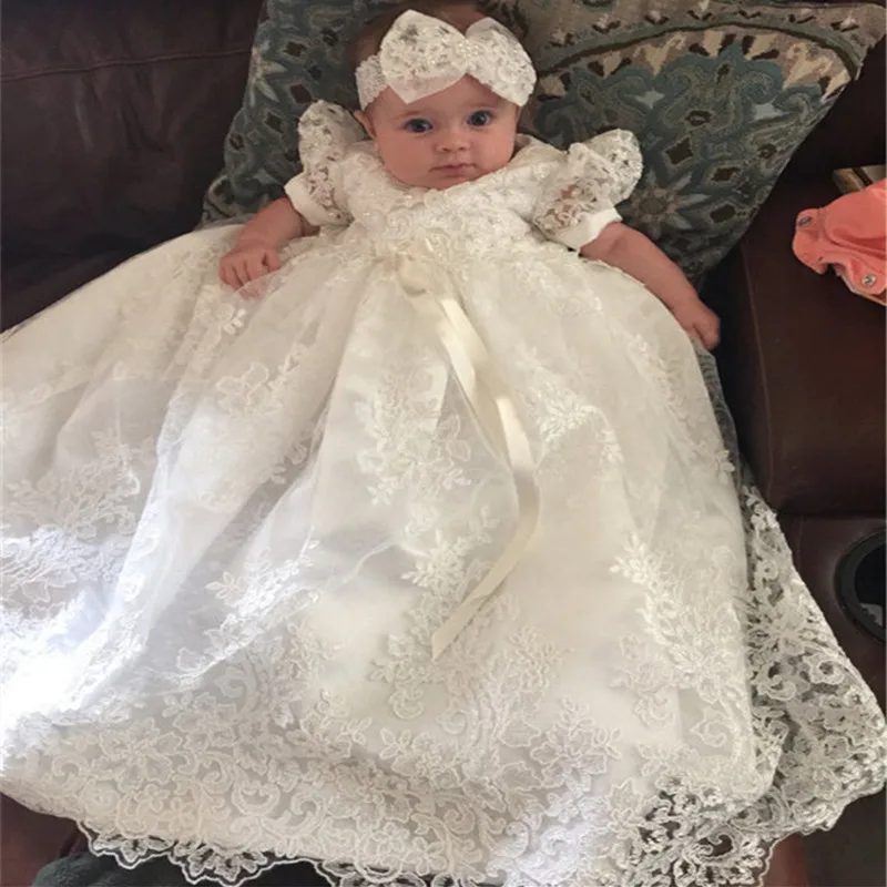 Винтажное детское кружевное платье для крещения, платье с рукавом до локтя для крещения, платья для первого причастия с шапочкой