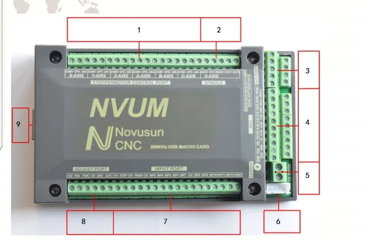 Поддержка локальных сетей; 12 портовая фотоэлектрический изолированные входной интерфейс если вы хотите заказать обычное цифровых данных; 10 портов фотоэлектрический изолированные Выходной интерфейс: если вы хотите заказать обычное цифровых данных; 1 порт 0-10 В Скорость вращения шпинделя аналоговый выходной интерфейс (можно изменить на выход ШИМ); Поддерживает 3-6 осевые шаговые системы, 200 кГц импульсный выход для каждой оси; Микросхема управления движением руки; Основным устройством является 12V-32VDC вход источника питания, ток должен быть выше 0,5a; Совместимо с MPG входом, поддерживает цифровой дисплей MPG от нашей компании.
