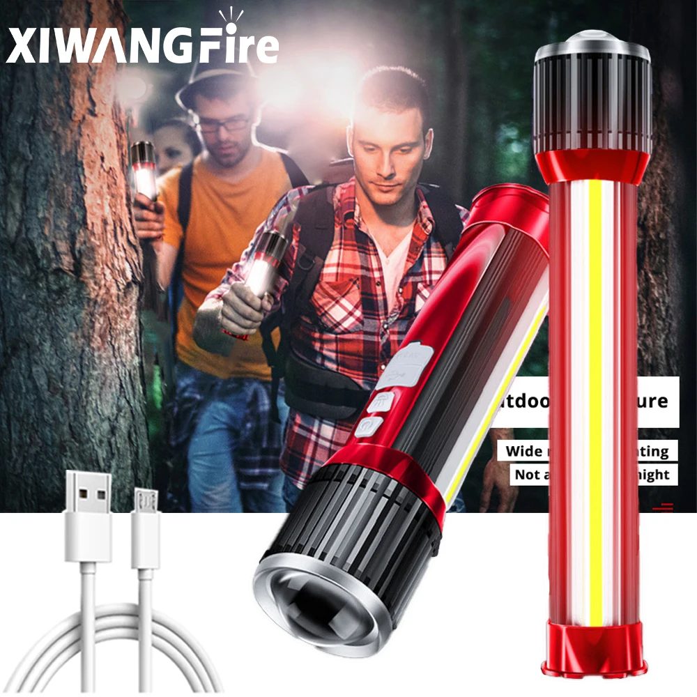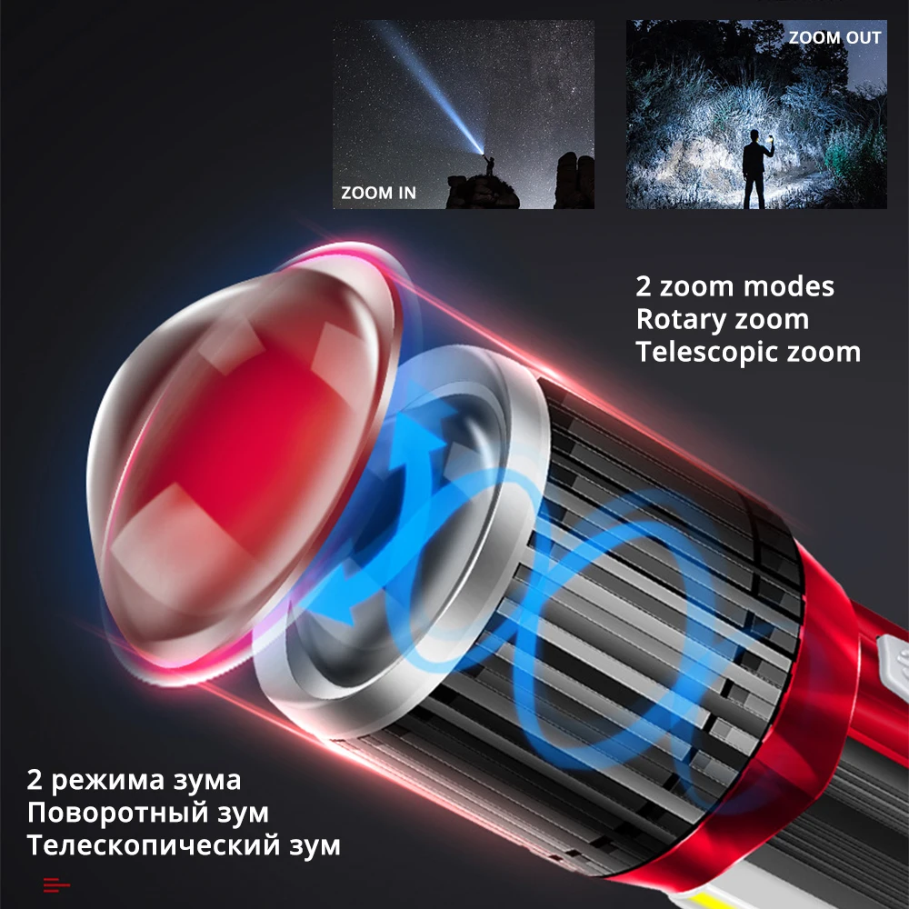 Уличный фонарик, вращающийся на телескопический светодиодный фонарь с зумом градусов, с боковым освещением, перезаряжаемый фонарик для кемпинга, внешний аккумулятор с прожектором
