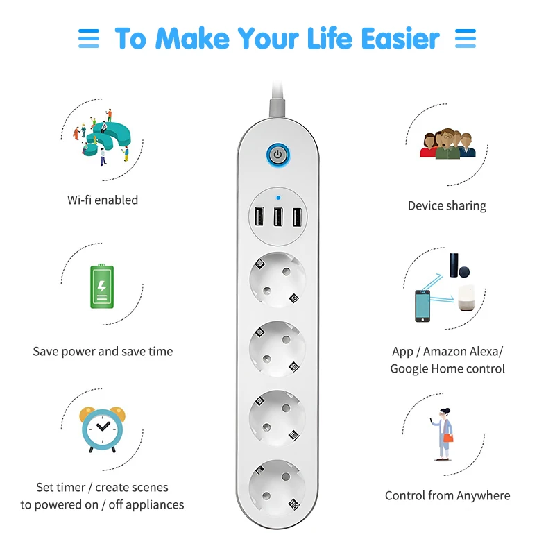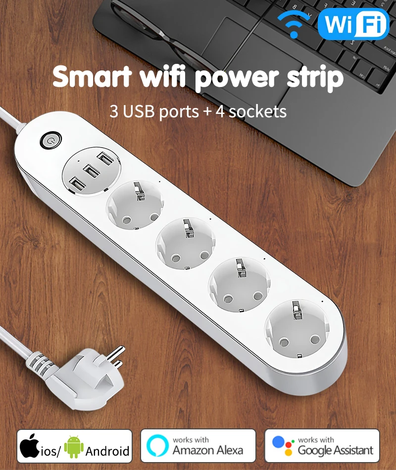 Это выглядит хорошо законченным. Легко связать с Google и Smart life. Вы можете активировать штекеры один за другим. USB можно активировать и отключить только три одновременно. Вы также можете активировать или деактивировать всю базу. Вы можете запрограммировать время включения/выключения.