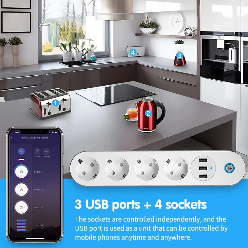 【 3 / 4 USB порта 4 sockets】розетки контролируются независимо, и usb-порты используются как блок, который может управляться мобильными телефонами в любое время и в любом месте.