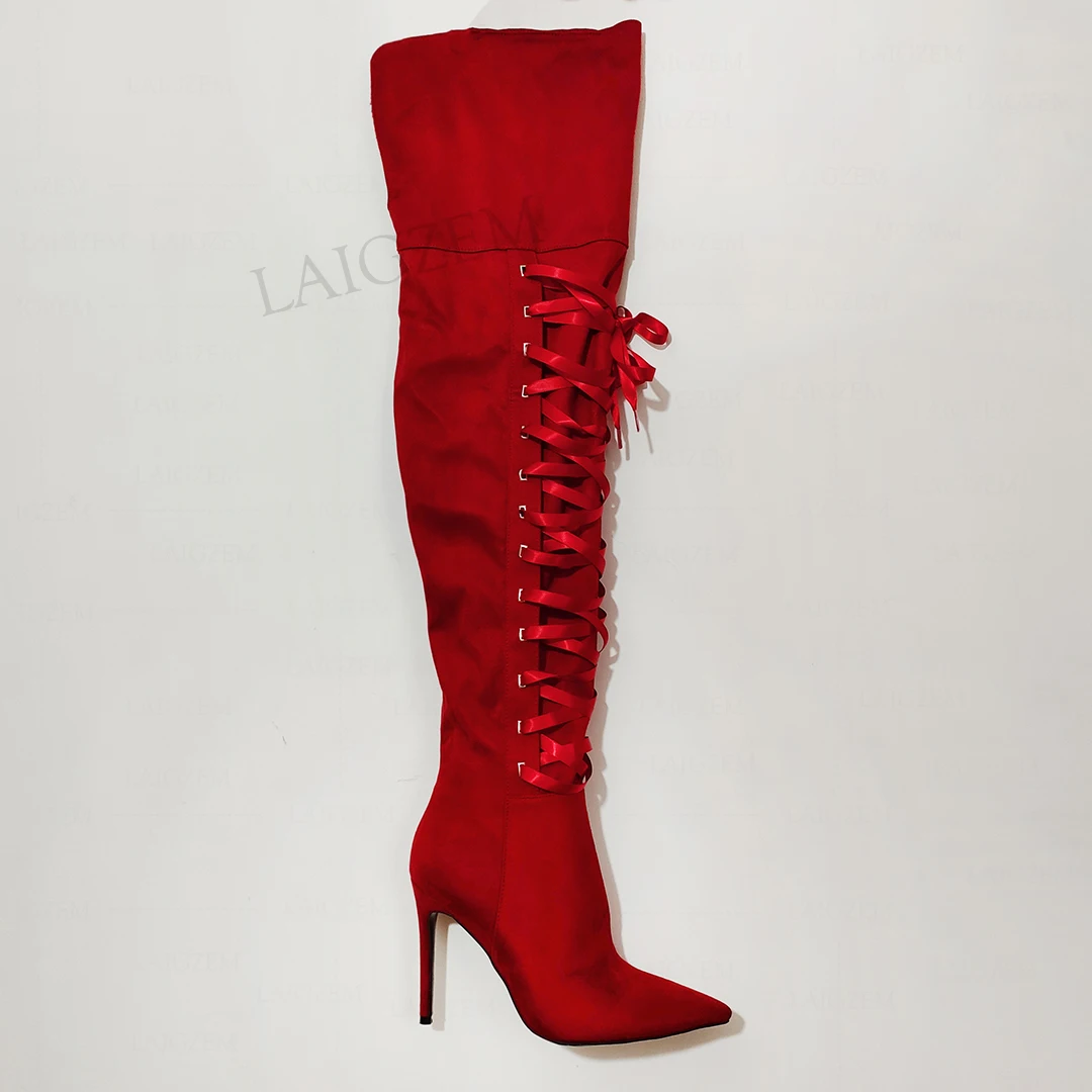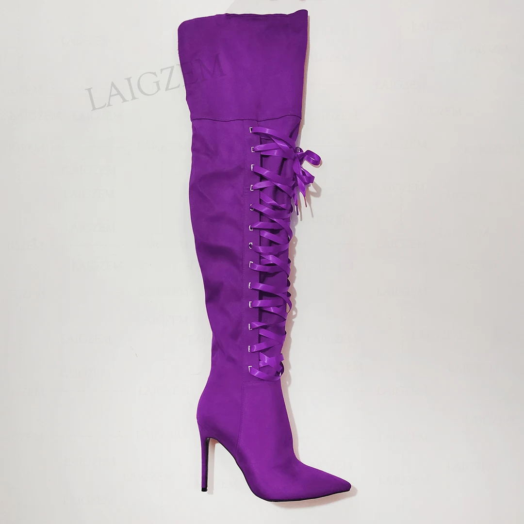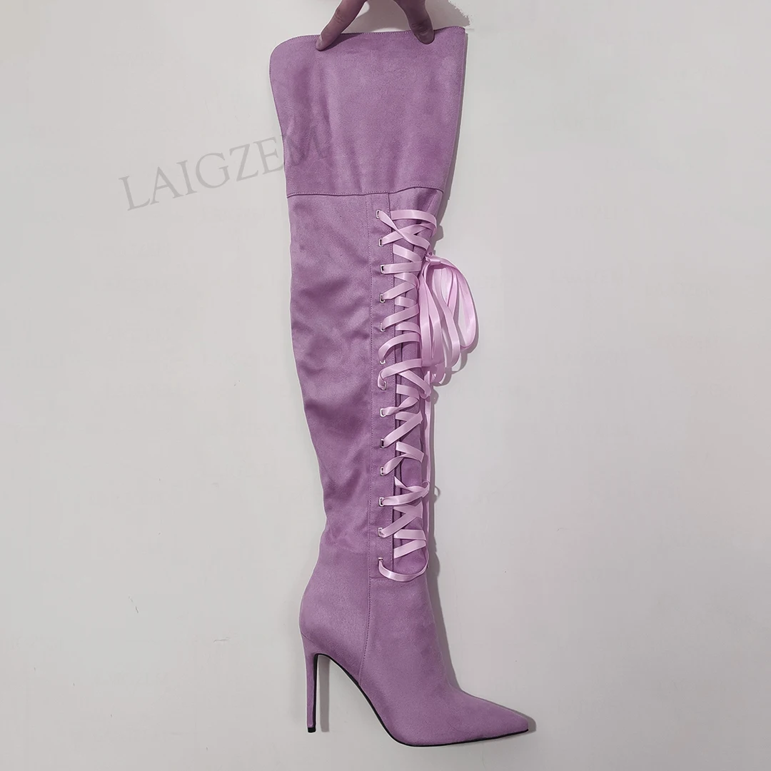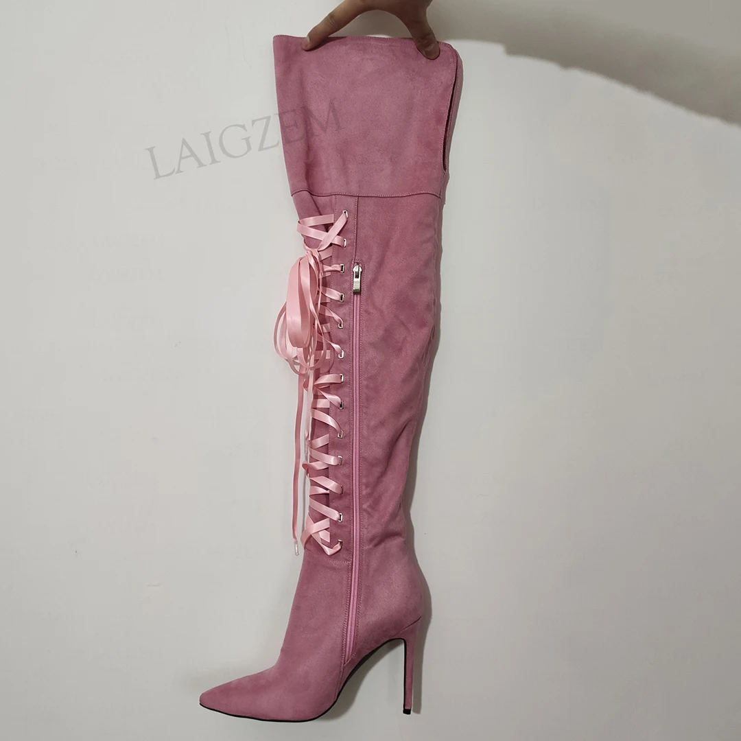 LAIGZEM FASHION Women Over Knee Boots Faux Suede Side Zip Thin Heels Thigh Boots Girls Shoes Woman Handmade Large Size 41 46 47