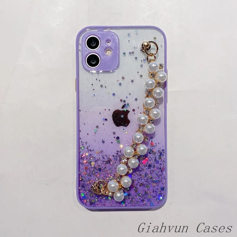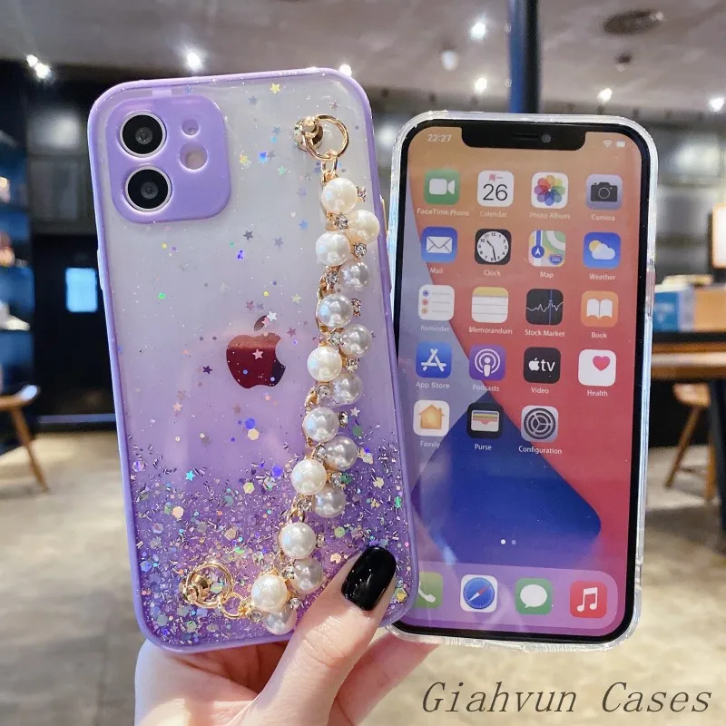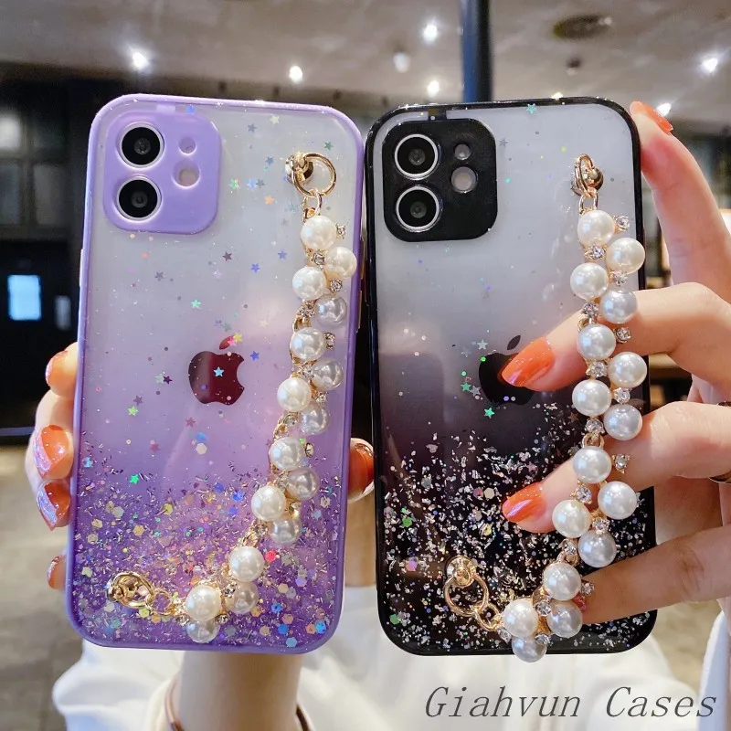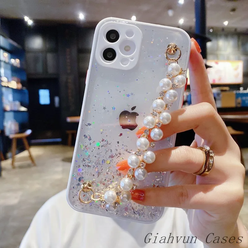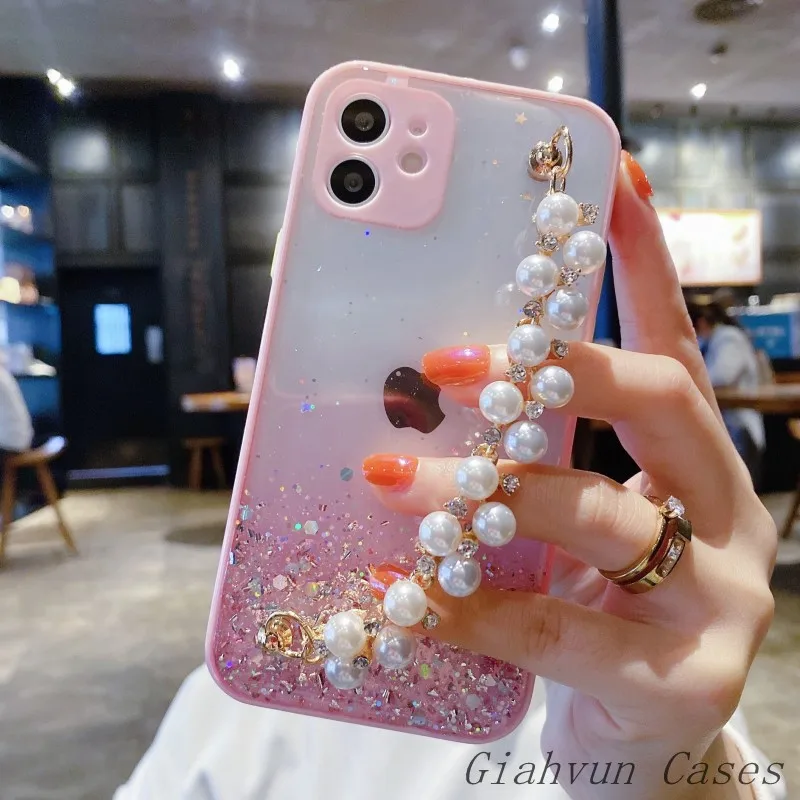 Чехол для iPhone 11 Pro XS Max 12 MiNi XR X 6S 7 8 plus, Samsung S20 FE S21 Ultra, с блестящим жемчужным браслетом и цепочкой