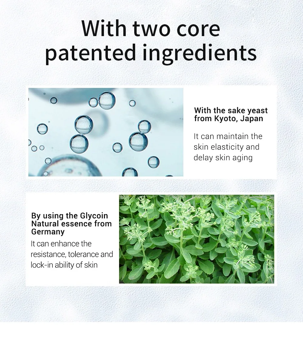 С двумя запатентованными ингредиентамиС Саке Дрожжи из киао, ЯпонияОн может поддерживать эластичность кожи и замедлять старение кожиИспользуя естественную эссенцию гликоина из ГерманииОн может повысить устойчивость, толерантность и блокировку кожи