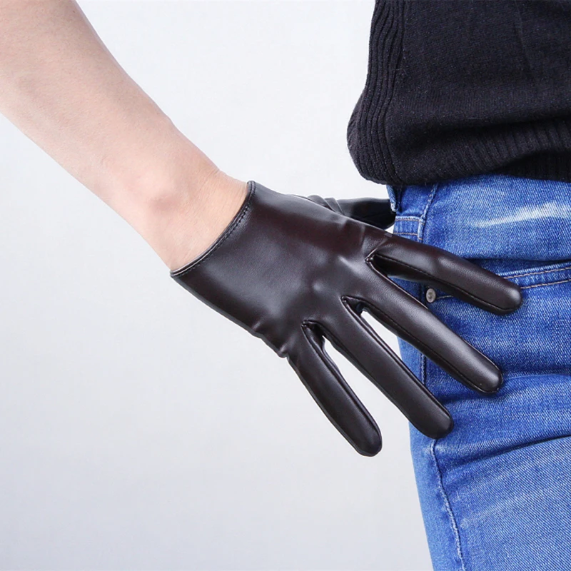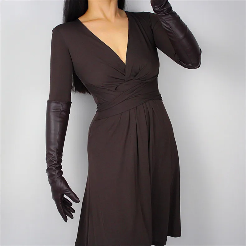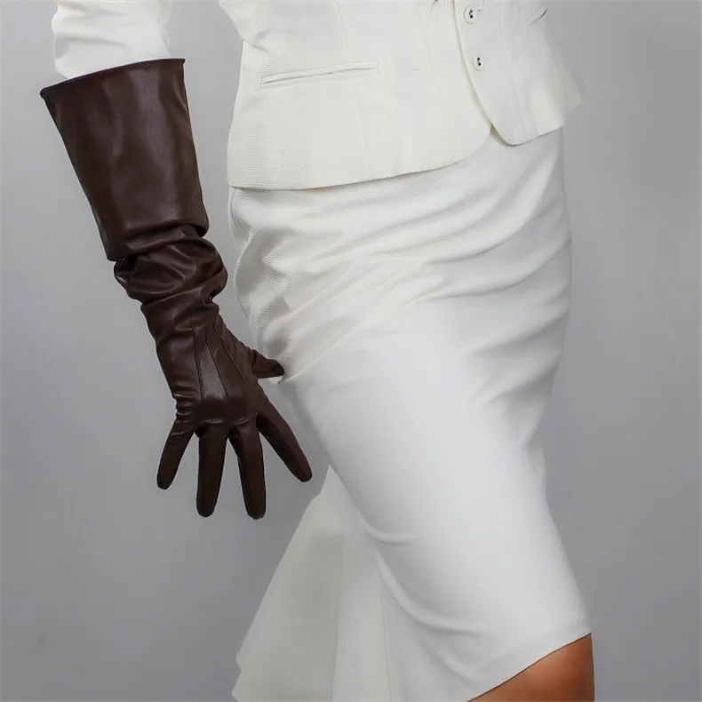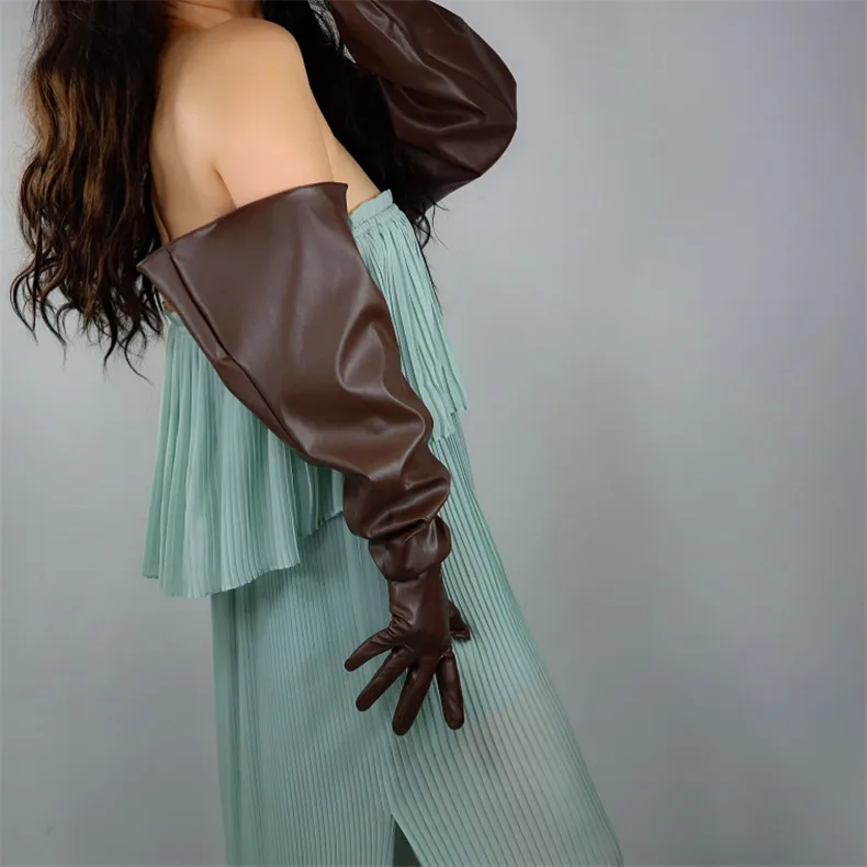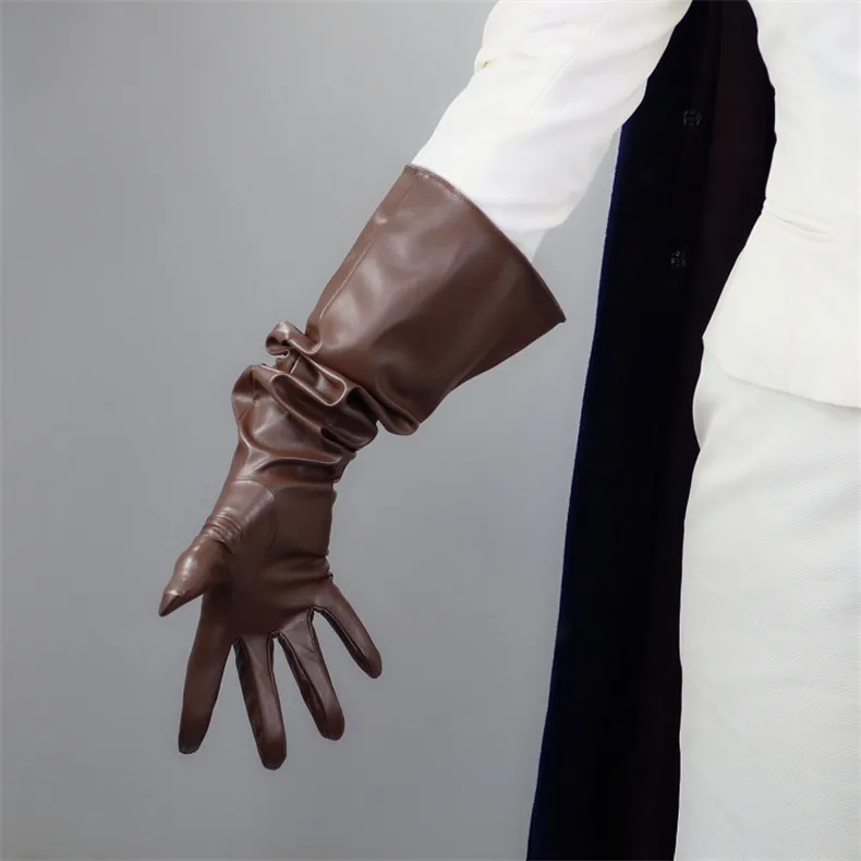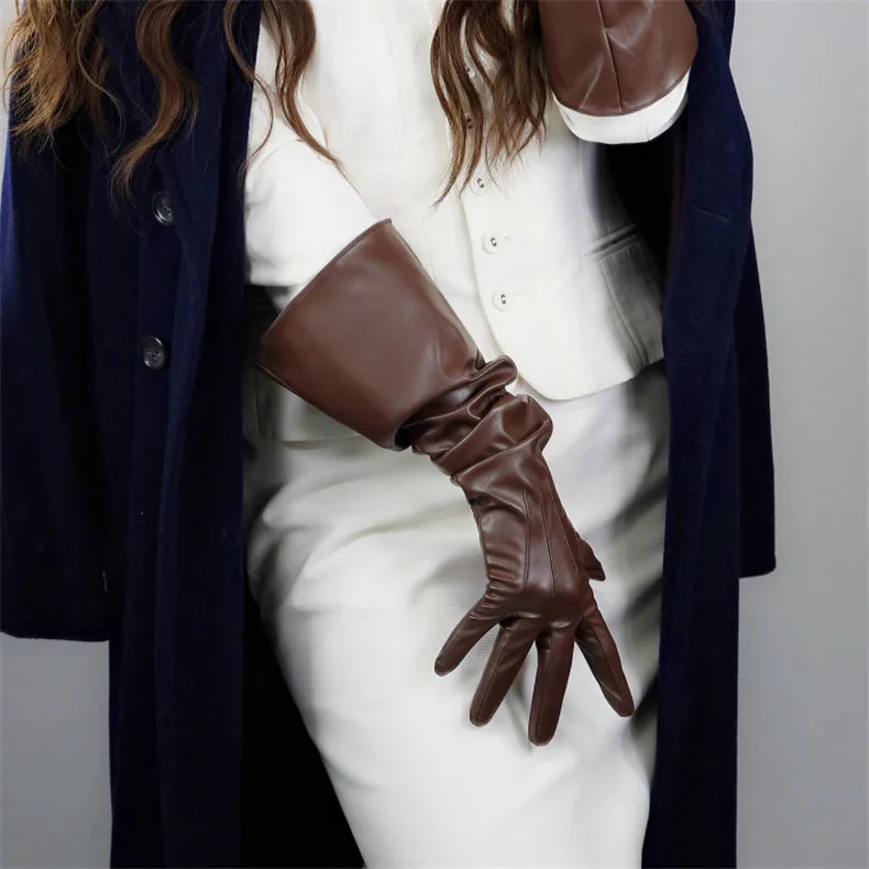 Длинные кожаные перчатки женские, 50 см, свободные, с большим рукавом, из искусственной кожи, кофейные, темно-коричневые, WPU315