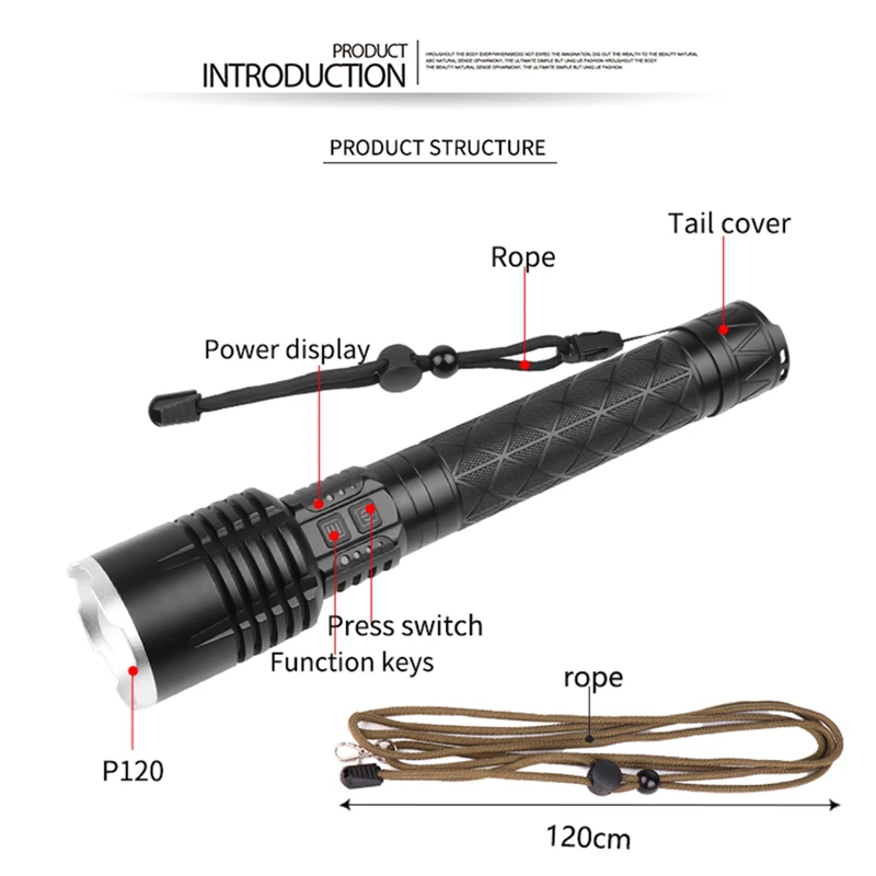 Светодиодная лампа: XHP100 Размер: 17,8 см * 4,8 см * 3,5 см Вес нетто: 232 г Материал: алюминиевый сплав Переключатель: двойной переключатель, выключатель питания + переключатель функций Питание: 1 * аккумулятор 26650 Зарядка: Зарядка через Micro USB, поддержка вывода Выход: 5 В/1 А Режим переключения: выключатель питания (3 режима освещения: слабый-средний-сильный) + Переключатель функций (Нажмите Супер яркий-двойной щелчок вспышки) Зум: телескопический зум Водонепроницаемость: IPX5 Время зарядки: 3-5 часов Вход и выход Новый 9-жильный фитиль с идеальным световым пятном Функция автоматического отключения питания при низком напряжении Нажмите и удерживайте в течение 3 секунд, чтобы включить/выключить свет, любая передача остается более 8 секунд, а затем нажмите, чтобы выключить светильник. Тип фонарика: охота, патрулирование, обслуживание, работа, поиск и спасение.