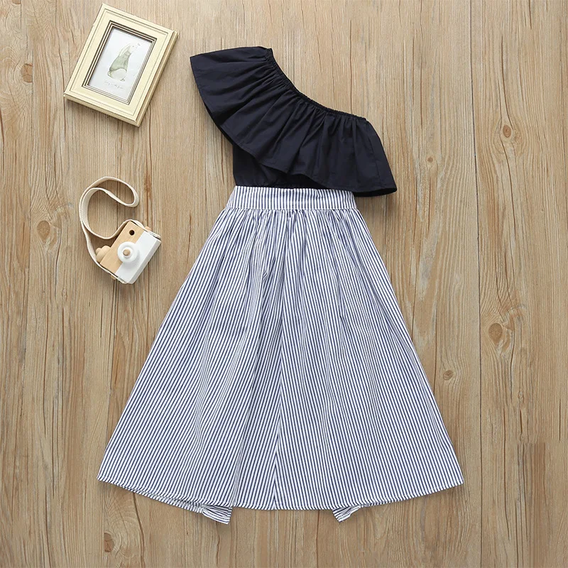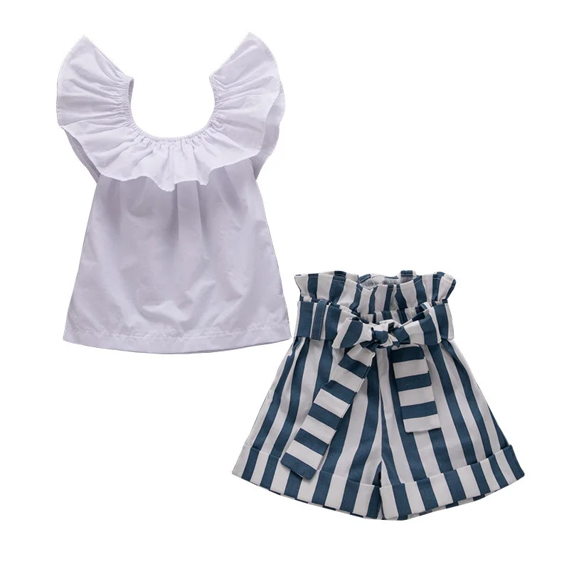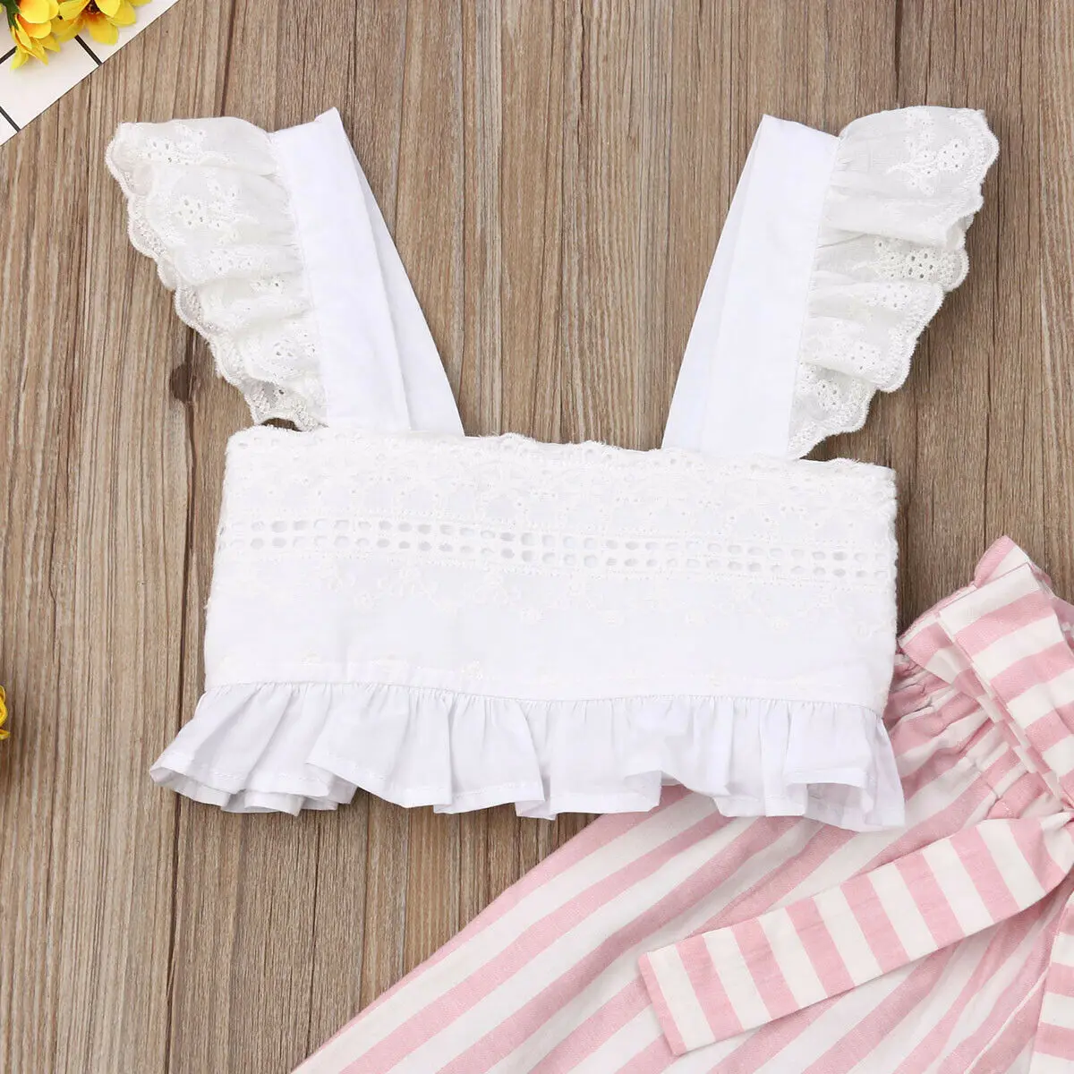 Комплект детской одежды, комплект для малышей, белый кружевной топ с широким рукавом + полосатые штаны на талии, летняя одежда для маленьких девочек, 2021