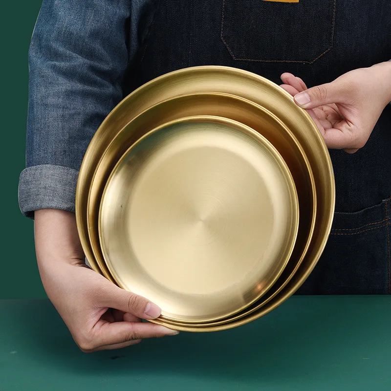 Золотые обеденные тарелки из нержавеющей стали, Сервировочные блюда, кухня, круглый поднос для торта, западные тарелки для стейков, разный размер