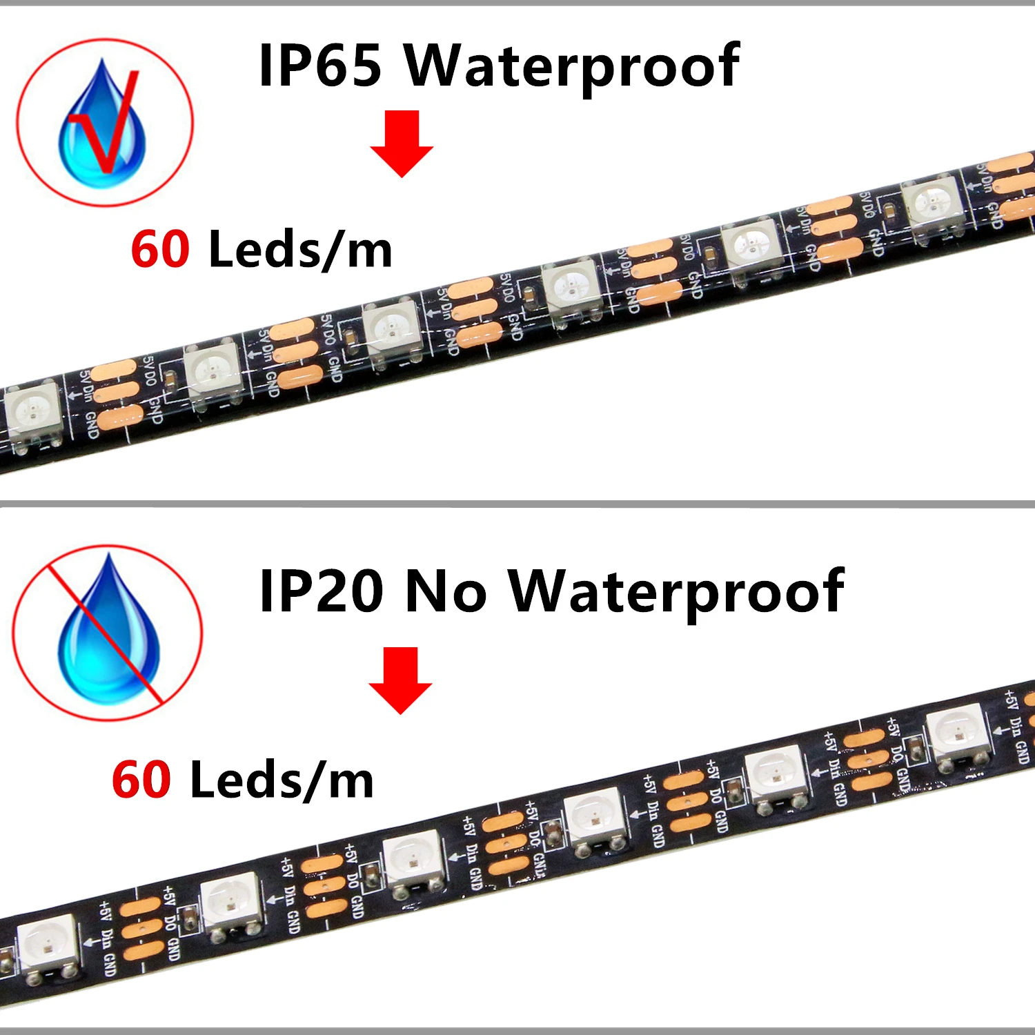 Светильник источник: 5050 RGB светодиодныйIC Модель: WS2812bСветодиодный Кол-во: 30 светодиодный s 1 м/60 Светодиодный s 1 мУгол обзора: 120 °Напряжение: 5 В постоянного токаВодонепроницаемый: IP30 не водонепроницаемый/IP65 водонепроницаемыйЦвет платы FPCB: черныйРабочая среда: от-40 ℃ до + 80 ℃Определение штифта:+ 5V, D, N/A, GND;Красный провод: 5 В +/зеленый провод: данные/белый провод: GND
