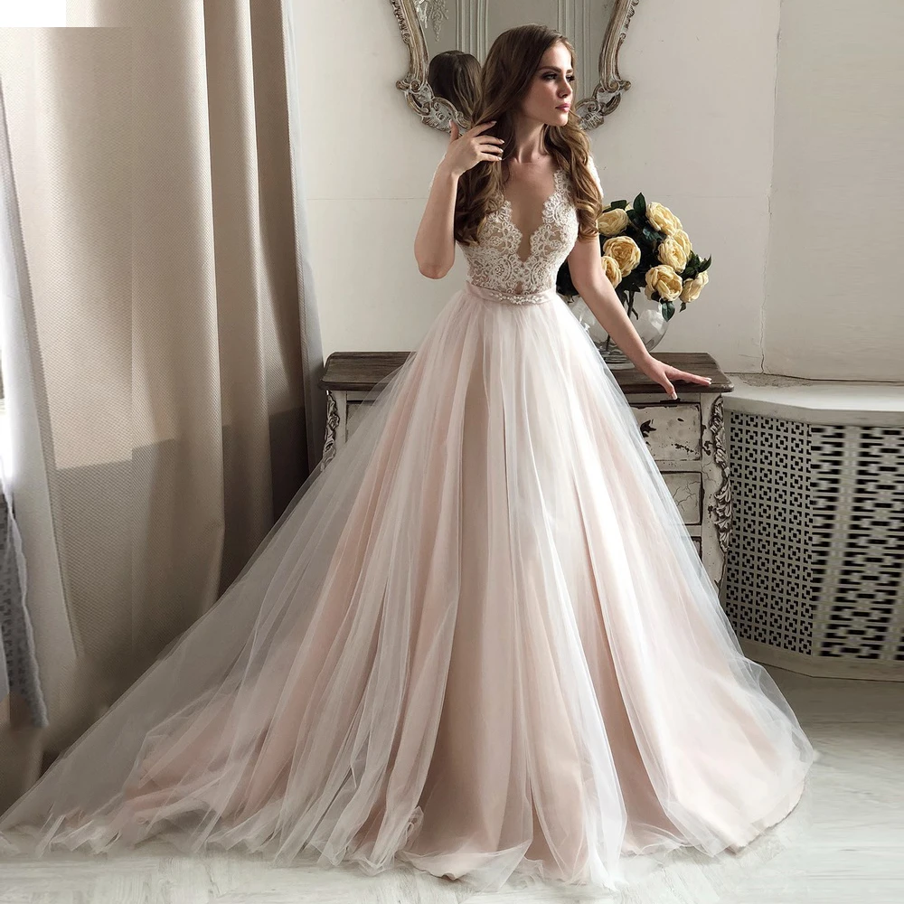 Элегантное кружевное Свадебное Платье Vestido De Novia ТРАПЕЦИЕВИДНОЕ Свадебное Платье с v-образным вырезом и коротким рукавом, аппликация, Свадебное Платье из тюля, Свадебное Платье