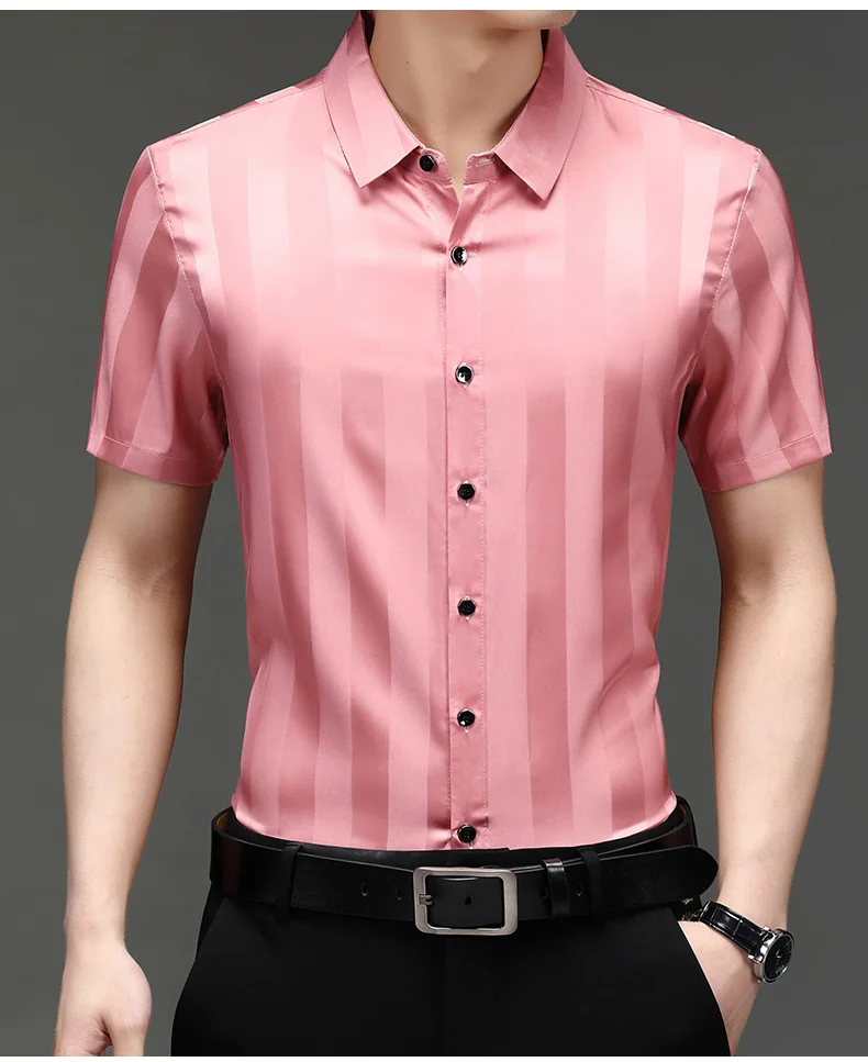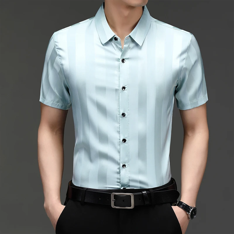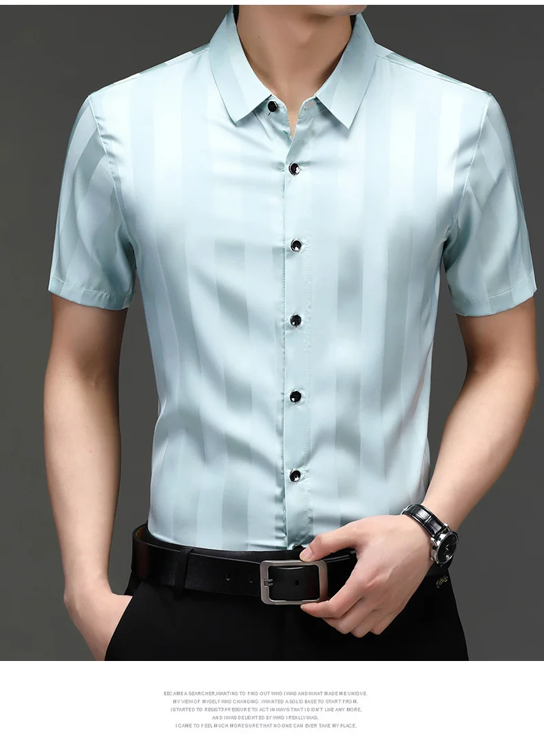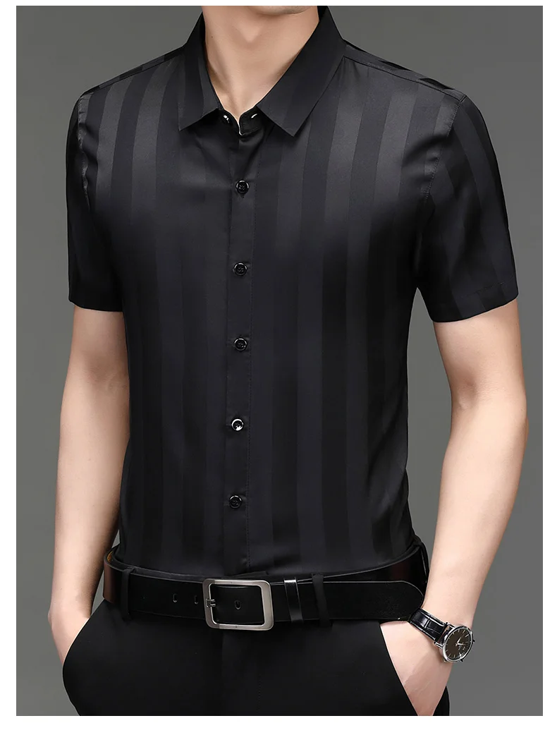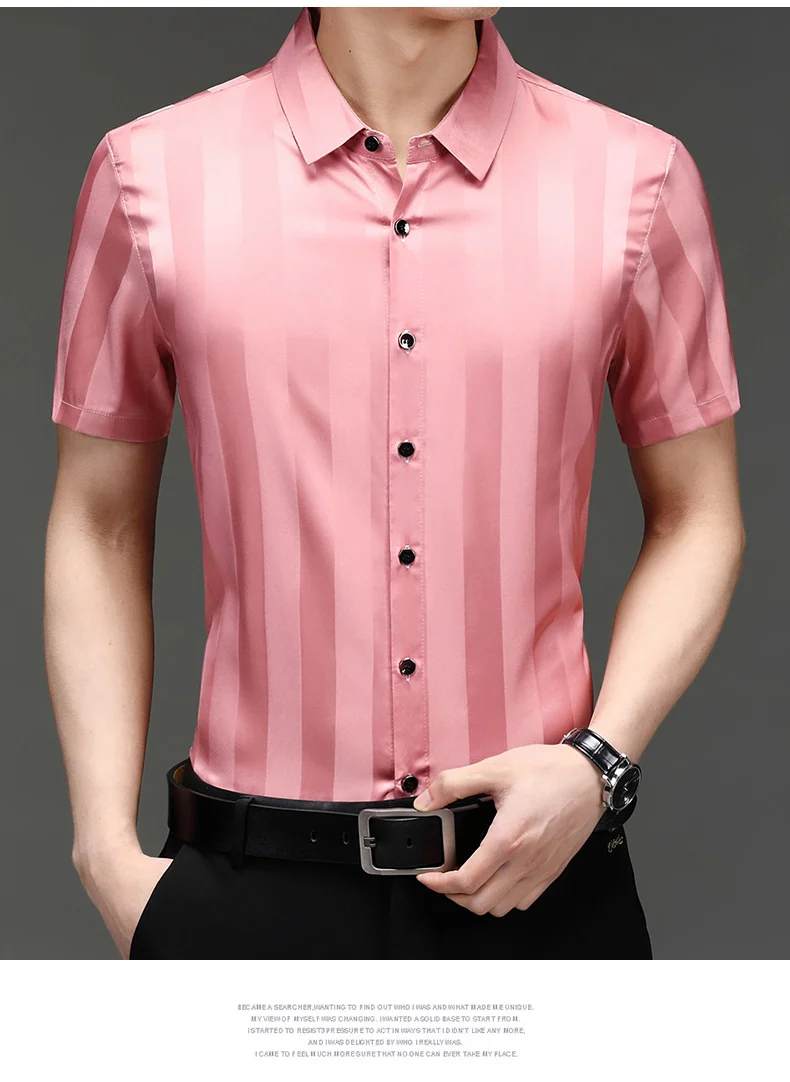 Мужская шелковая одежда летняя мода в широкую полоску Мягкие Блузки из поплина Мужская модная повседневная Уличная одежда с коротким рукавом шелковые платье прямого кроя