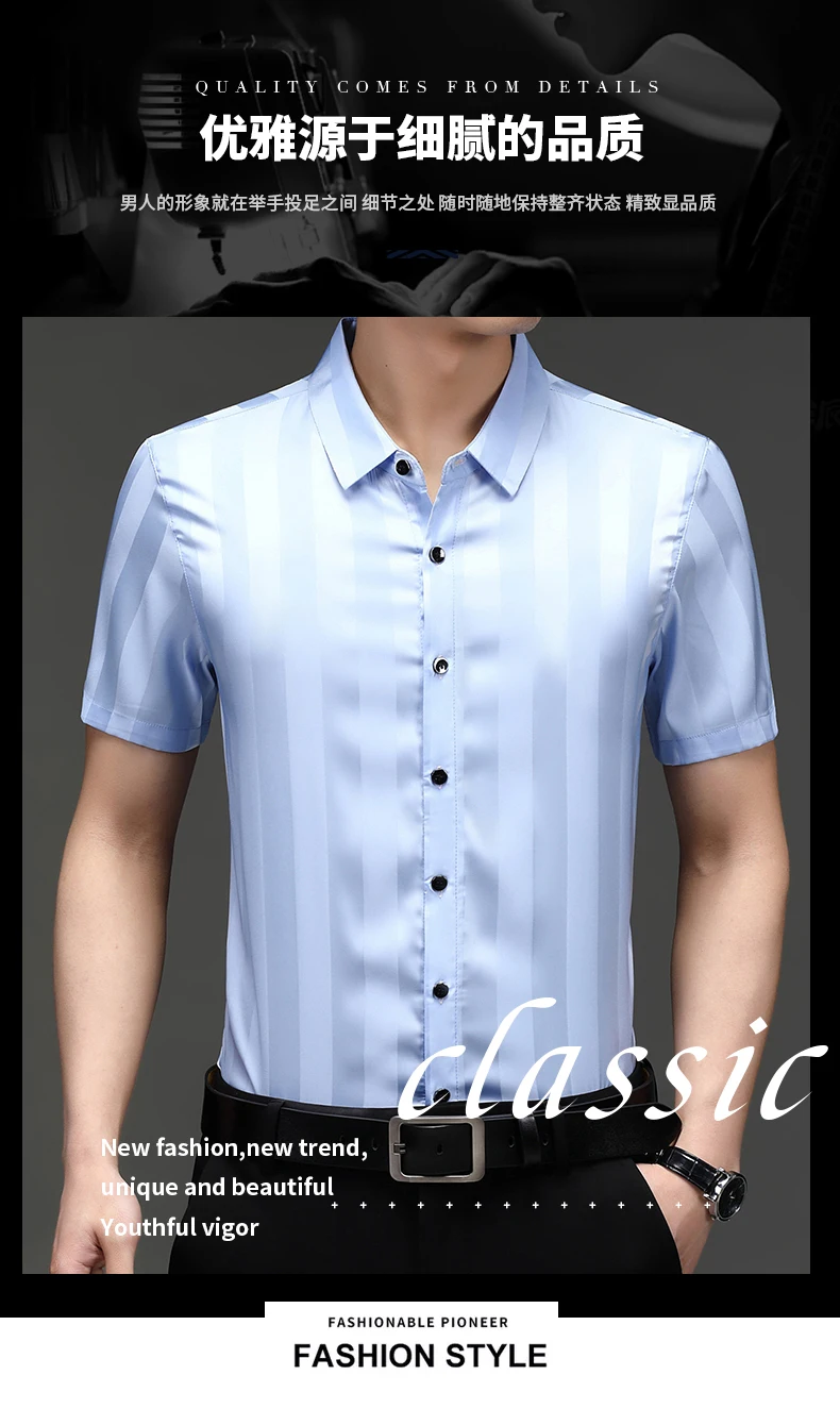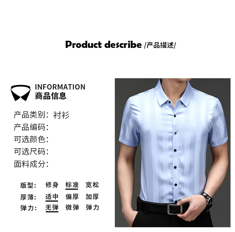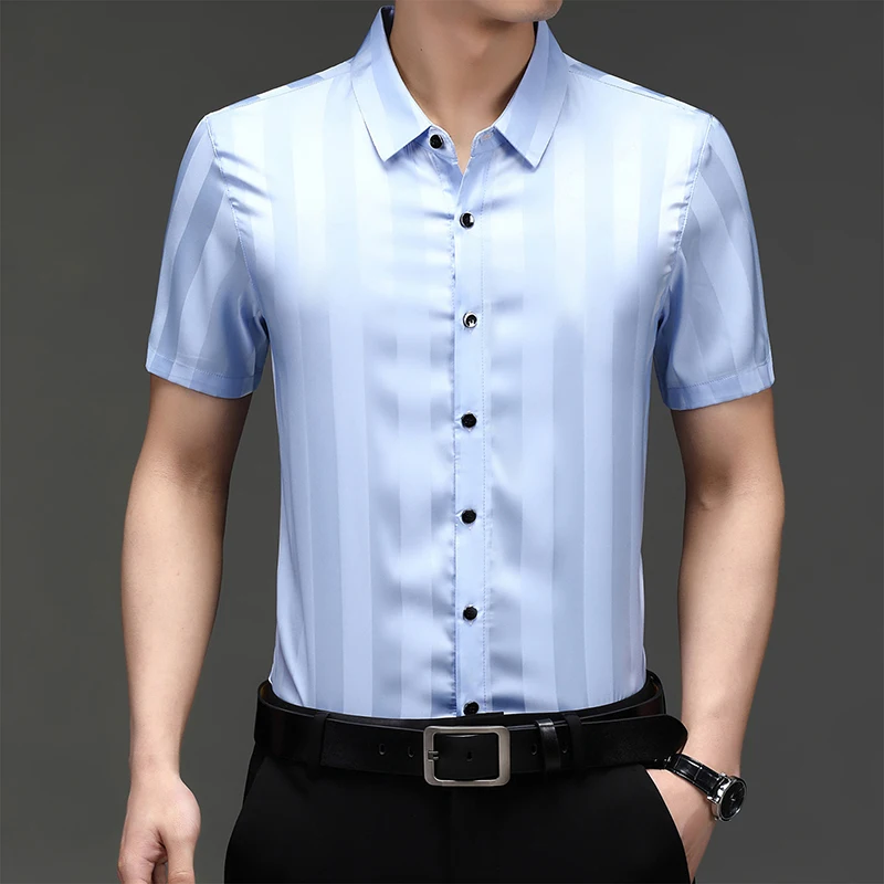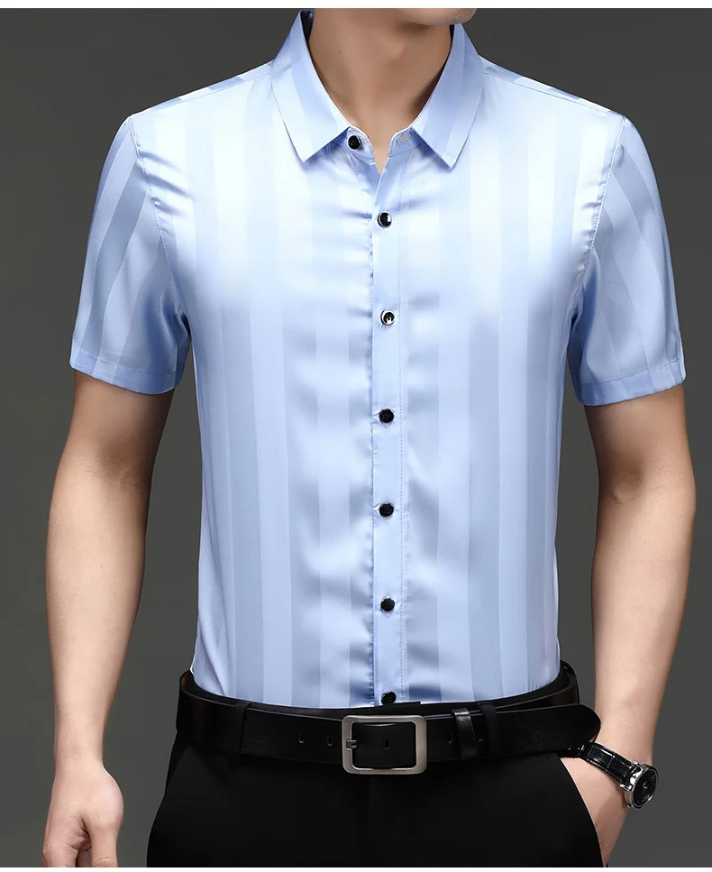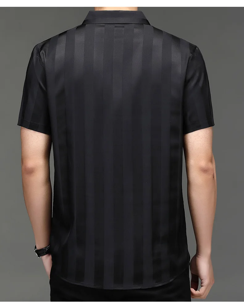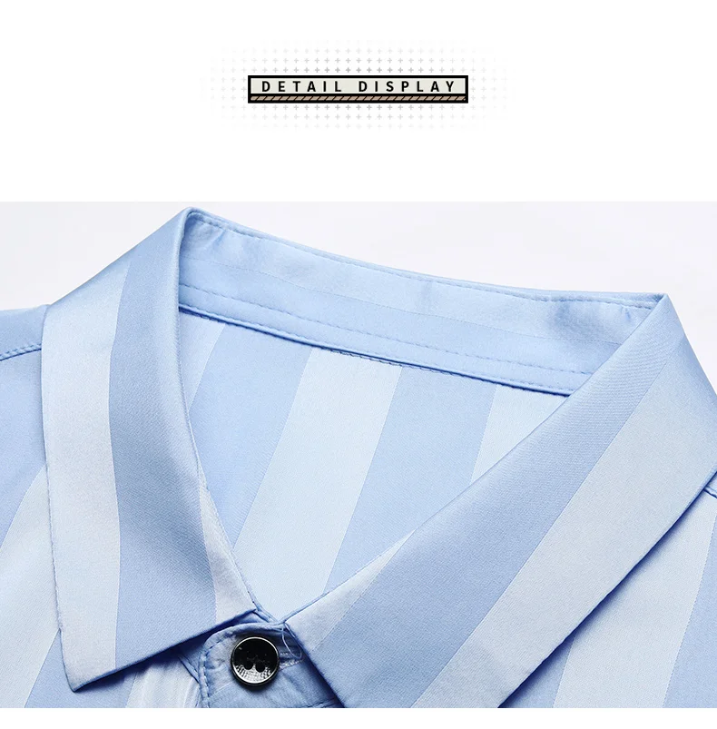 Мужская шелковая одежда летняя мода в широкую полоску Мягкие Блузки из поплина Мужская модная повседневная Уличная одежда с коротким рукавом шелковые платье прямого кроя