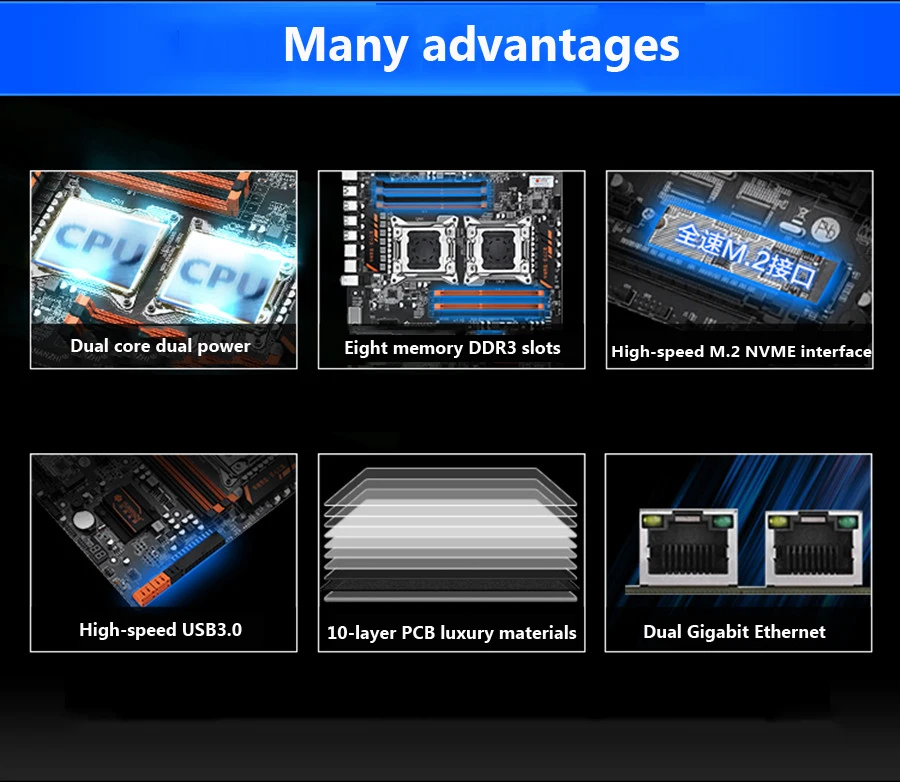 1. Поддержка процессоров Intel®2011 процессоры 2.8xDDR3 слот памяти, DDR3 1866/1600/1333 МГц 3. Поддержка NON-ECC/REG ECC/ECC памяти M.2 интерфейс 4,10 слой PCB,7 + 7 фаз питания 5,4 x USB 3,0 порт (ы) (2 на задней панели, 2 на средней плате),6 x USB 2,0 порт (ы) 6,2 x PCIe 3,0/2,0x16 (режим x16) ,2 x PCIe 3,0/2,0 x1 7.RJ45 Gigabit Ethernet карта * 2 8. Высокоэффективный металлический радиатор)