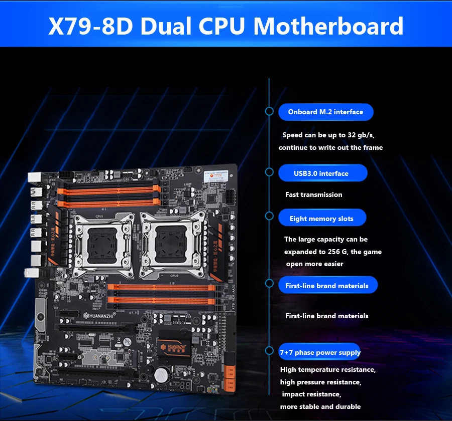 HUANANZHI X79-8D Intel Dual CPU материнская плата для LGA 2011 Xeon E5 DDR3 133316001866 МГц 256 ГБ M.2 NVME SATA3 USB3.0 E-ATX