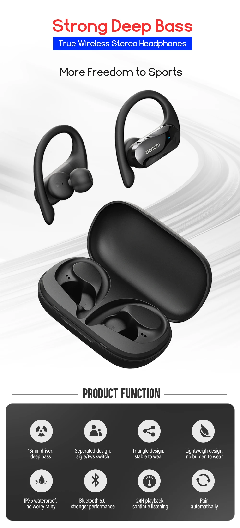 DACOM G05 TWS Bluetooth наушники, настоящие беспроводные наушники, спортивные наушники для бега, ушные крючки, стерео наушники для iPhone Samsung