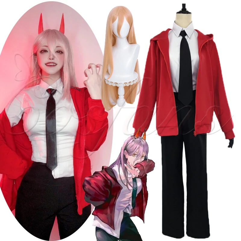 Аниме бензопила человек Сила Косплей Костюм Парики обувь наряд-Униформа красная куртка толстовки брюки Дьявол Рог галстук-бабочка костюмы для Хэллоуина