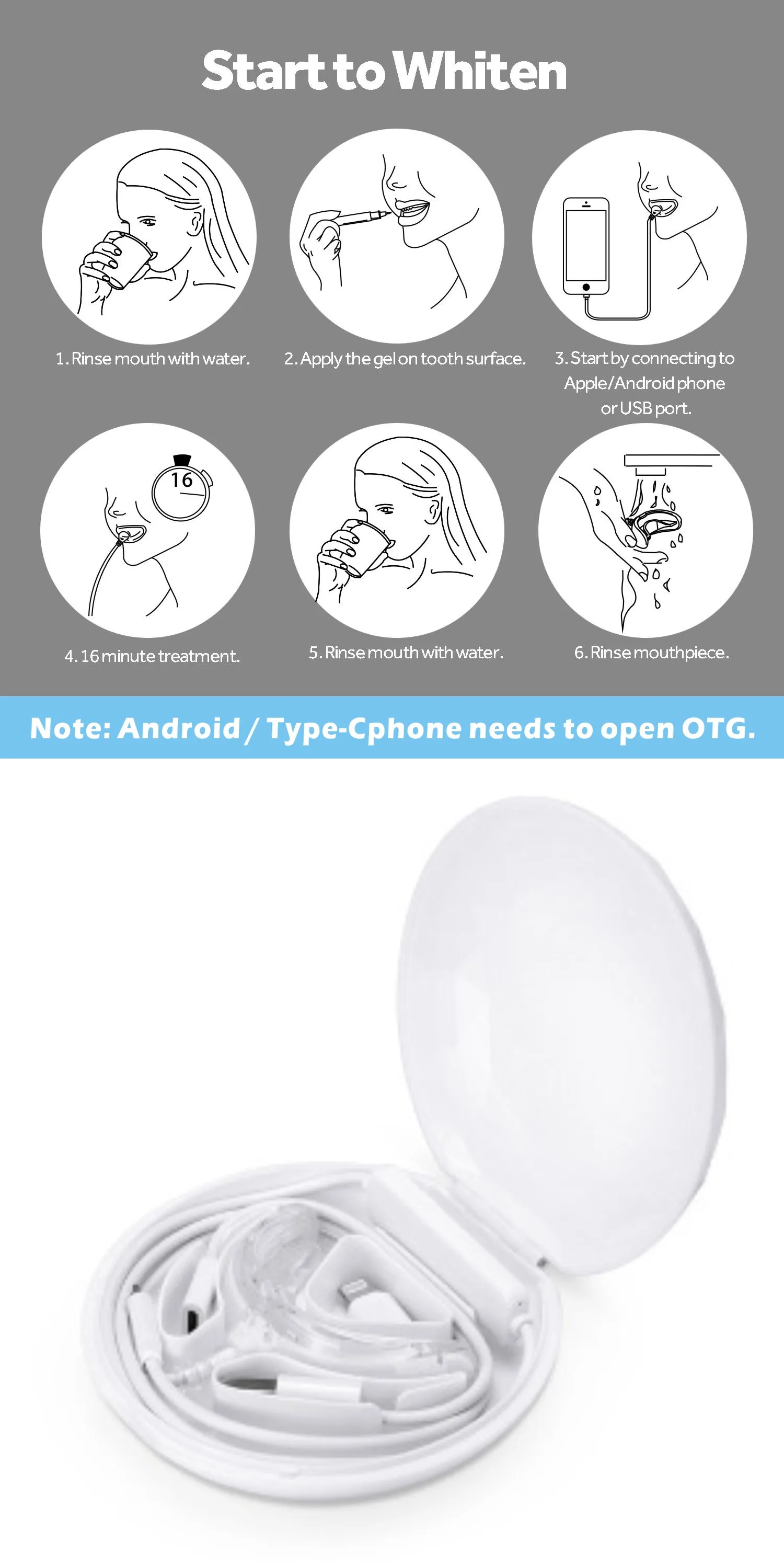 1. Вымойте и высушите поверхность зубов водой с помощью салфеток для зубов2. Очистите синий светильник для отбеливания зубов теплой водой и высушите его тканями3. Подключите конвертер с синим отбеливающим светильник для зубов с поставщиком питания (смартфон, внешний аккумулятор, компьютер, зарядное устройство с USB подключением), синий светильник.4. Отбеливающий гель Daub для зубов равномерно на поверхности синий светильник, толщина около 1 мм5. Положите синий светильник в рот, бит светильник ly для того, чтобы сделать отбеливающий гель рядом с зубами.6. Выньте синий светильник и краску через 30 минут после отбеливания. Если у зубов нет анафиlacческой реакции, можно сделать еще раз, чтобы улучшить отбеливающий эффект.