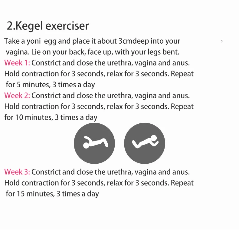1. Спортивные тренировки Выберите яйцо вульвы, положите его во влагалище на глубину 3 см, начните Упражнение Регулярные упражнения: ходьба, ходьба Расширенные упражнения: приседание на корточки, бег трусцой, ходьба вверх и вниз по ступенькам 2. Тренажер Kegel Возьмите Йони яйцо и поместите его около 3 см глубоко во влагалище. Ложитесь на спину, лицом вверх, согнув ноги Неделя 1: строгая и закрывающая уретру, влагалище и анус. Удерживайте сжатие в течение 3 секунд, расслабьтесь в течение 3 секунд. Повторите в течение 5 минут, 3 раза в день Неделя 2: строгая и закрывающая уретру, влагалище и анус. Удерживайте сжатие в течение 3 секунд, расслабьтесь в течение 3 секунд. Повторите в течение 10 минут, 3 раза в день Неделя 3: строгая и закрывающая уретру, влагалище и анус. Удерживайте сжатие в течение 3 секунд, расслабьтесь в течение 3 секунд. Повторите 15 минут, 3 раза в день