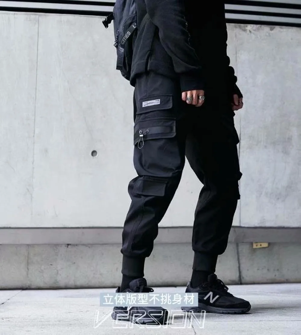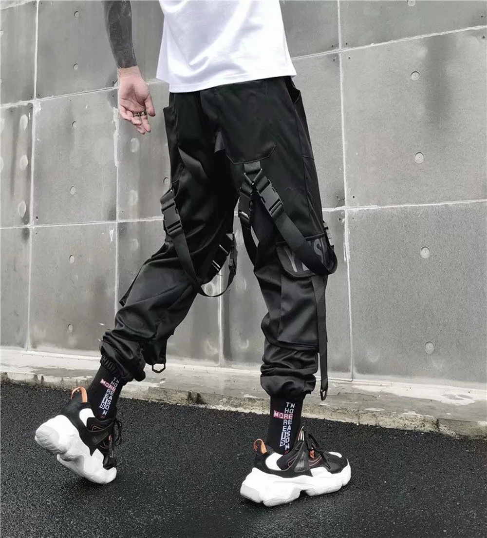 Брюки-карго для мужчин и женщин, джоггеры, спортивные штаны, с лентами, уличная одежда, брюки-султанки, стиль хип-хоп, черный