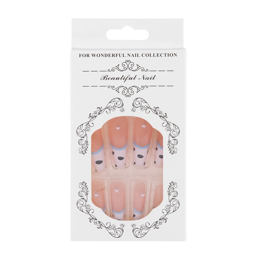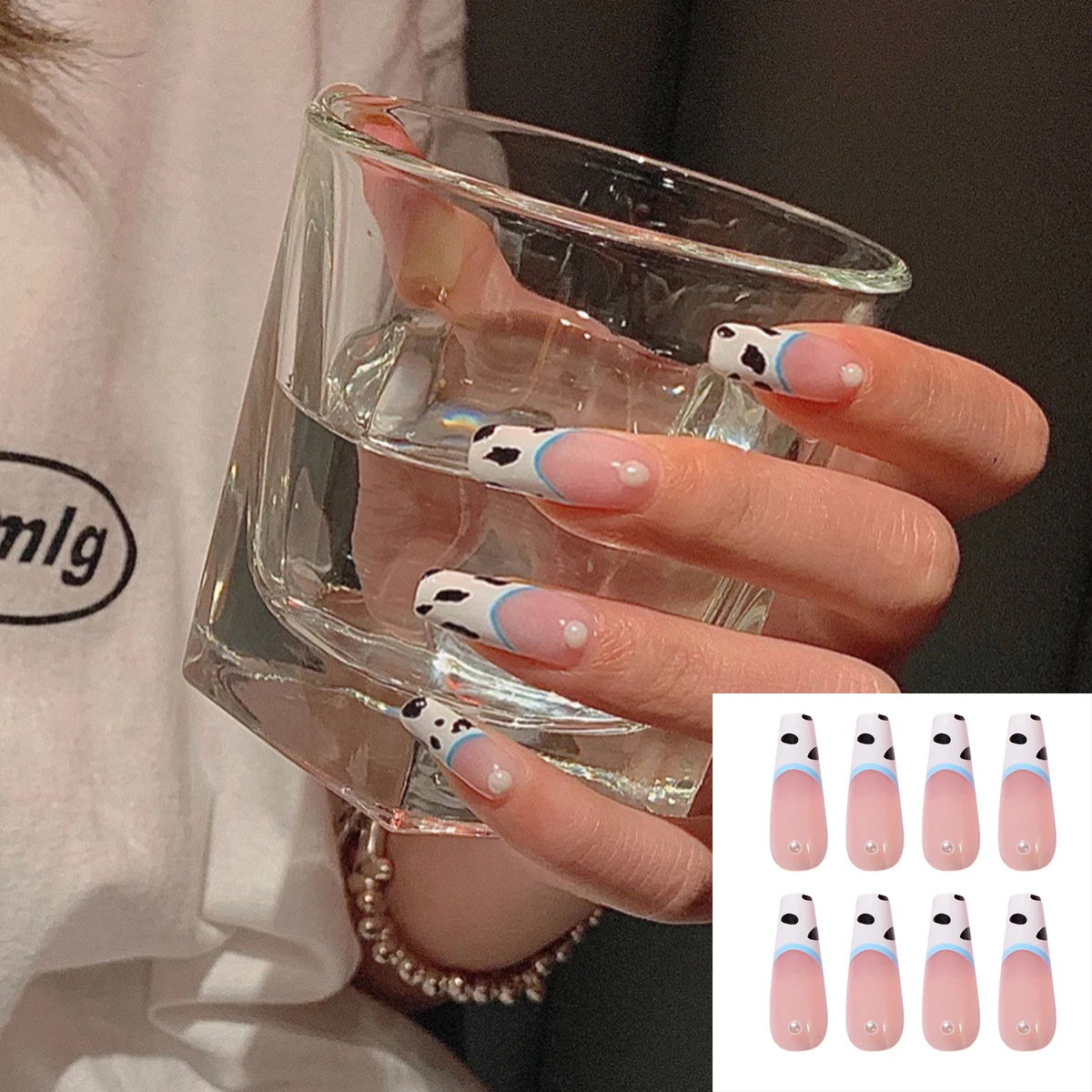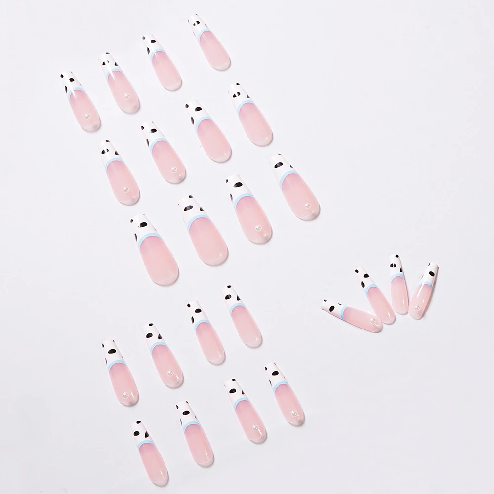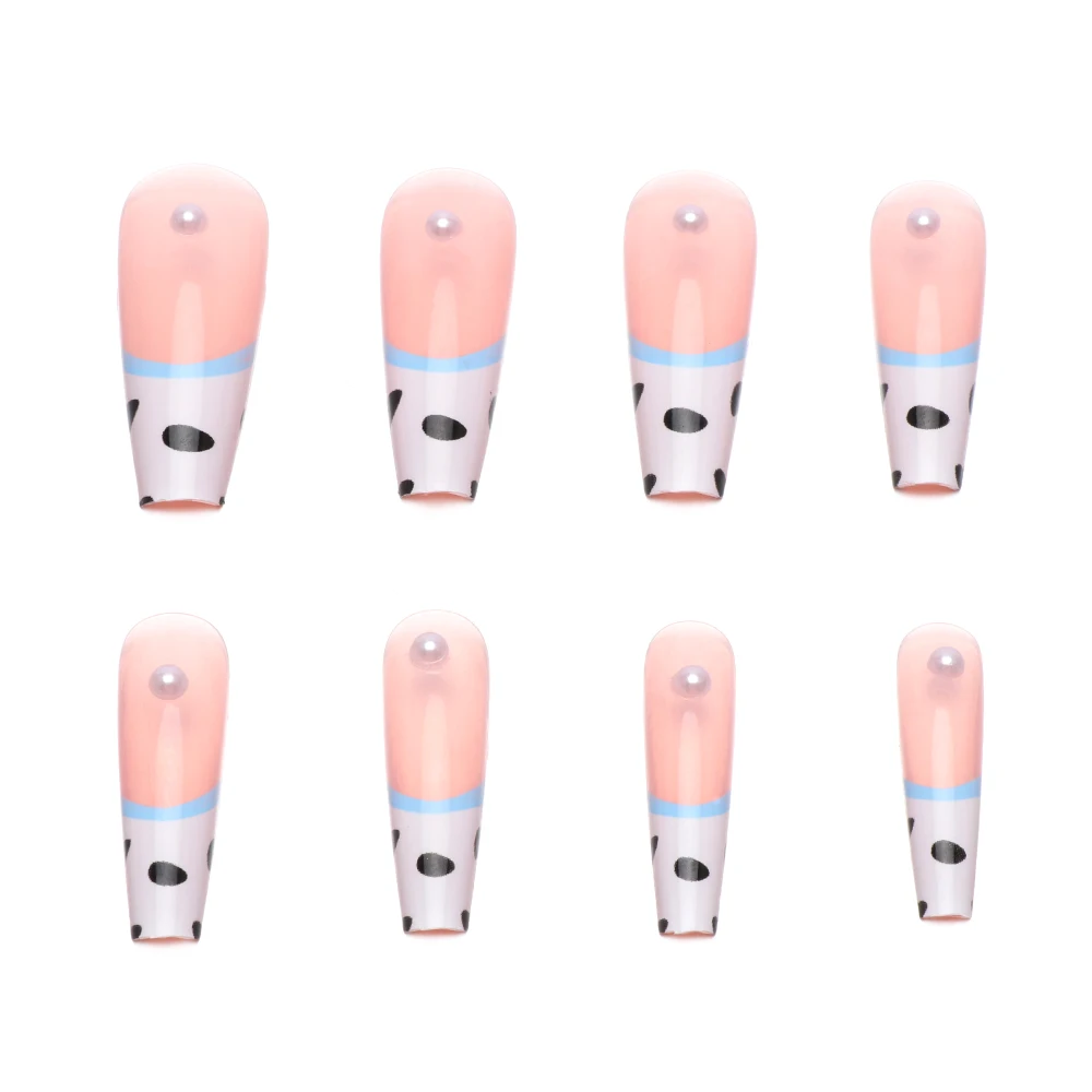 24 шт. накладные ногти с узором коровы с клеем, Длинные балерины, жемчуг, носимый маникюрный пресс на ногти, гроб, искусственные ногти